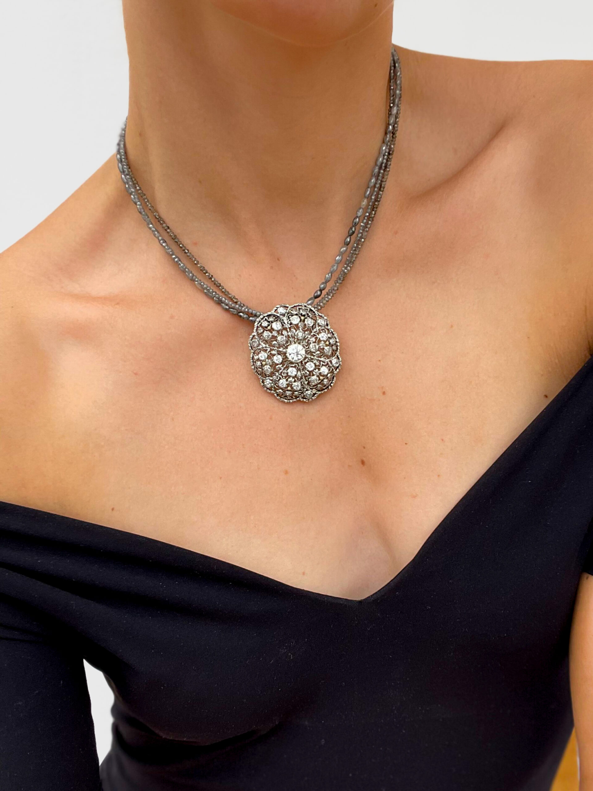 The weight of brooch is 14,2 gr., the central diamond is estimated 1.5-2 ct. plus other 3.3 ct. diamonds circa. The brooch is signed by M. Buccellati on the pin as usual for that kind of jewel.