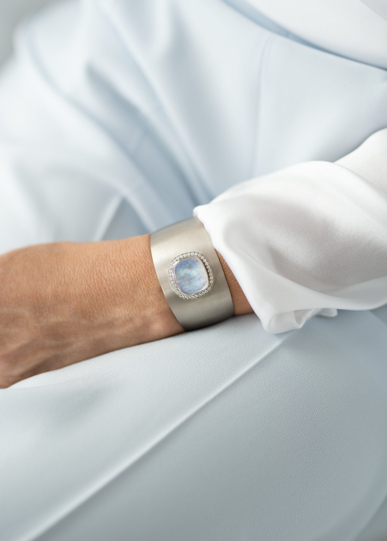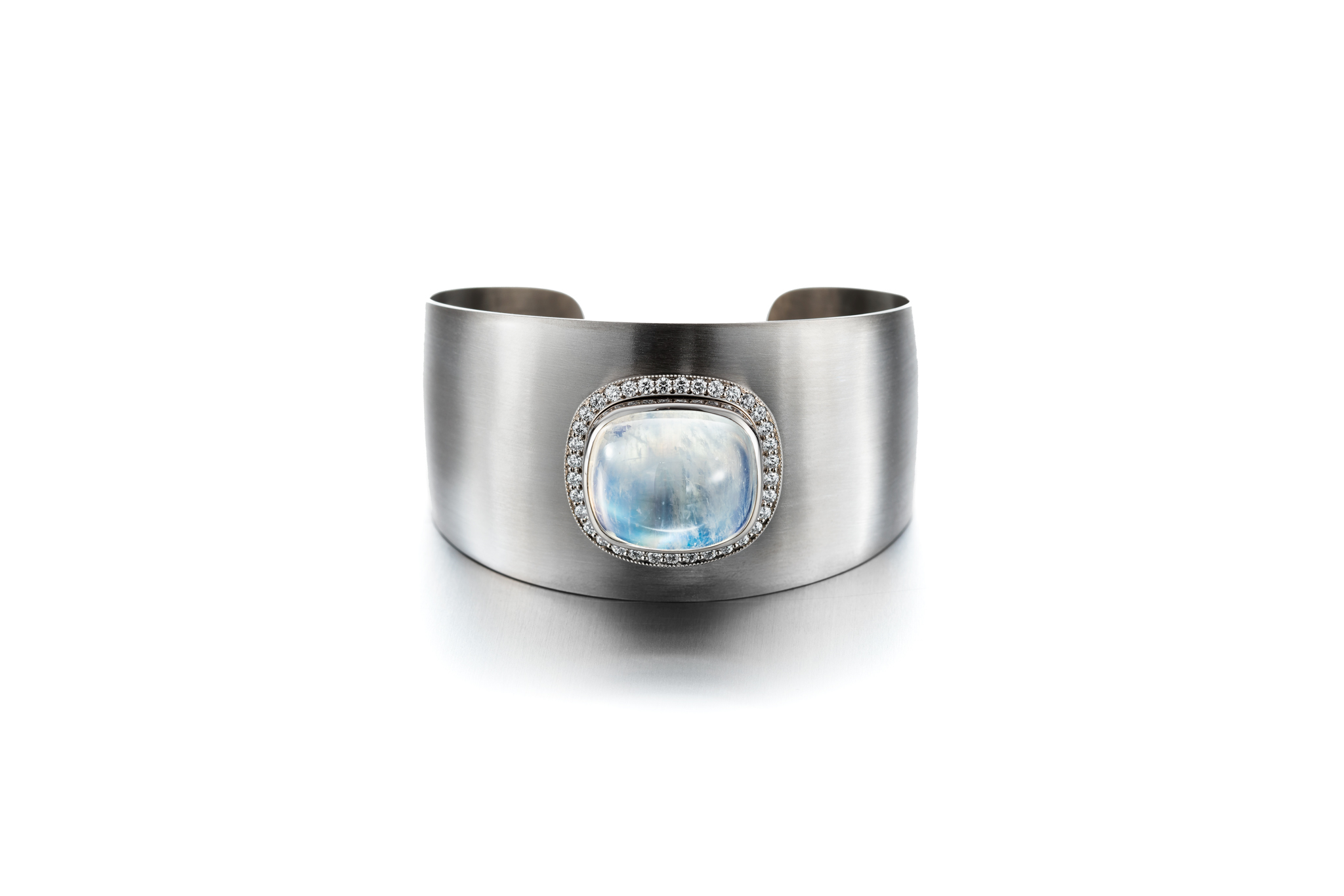 This unique piece is handmade in our workshop, as well as all our jewelry. Designing one of a kind pieces of jewelry is our core expertise. It’s inspiring and never gets boring. In this bracelet, the adularescence of the moonstone is almost like a dream. The soft blue light of the gemstone emits is something you could admire for hours. Handcrafted by our master goldsmith Janne Salminen.