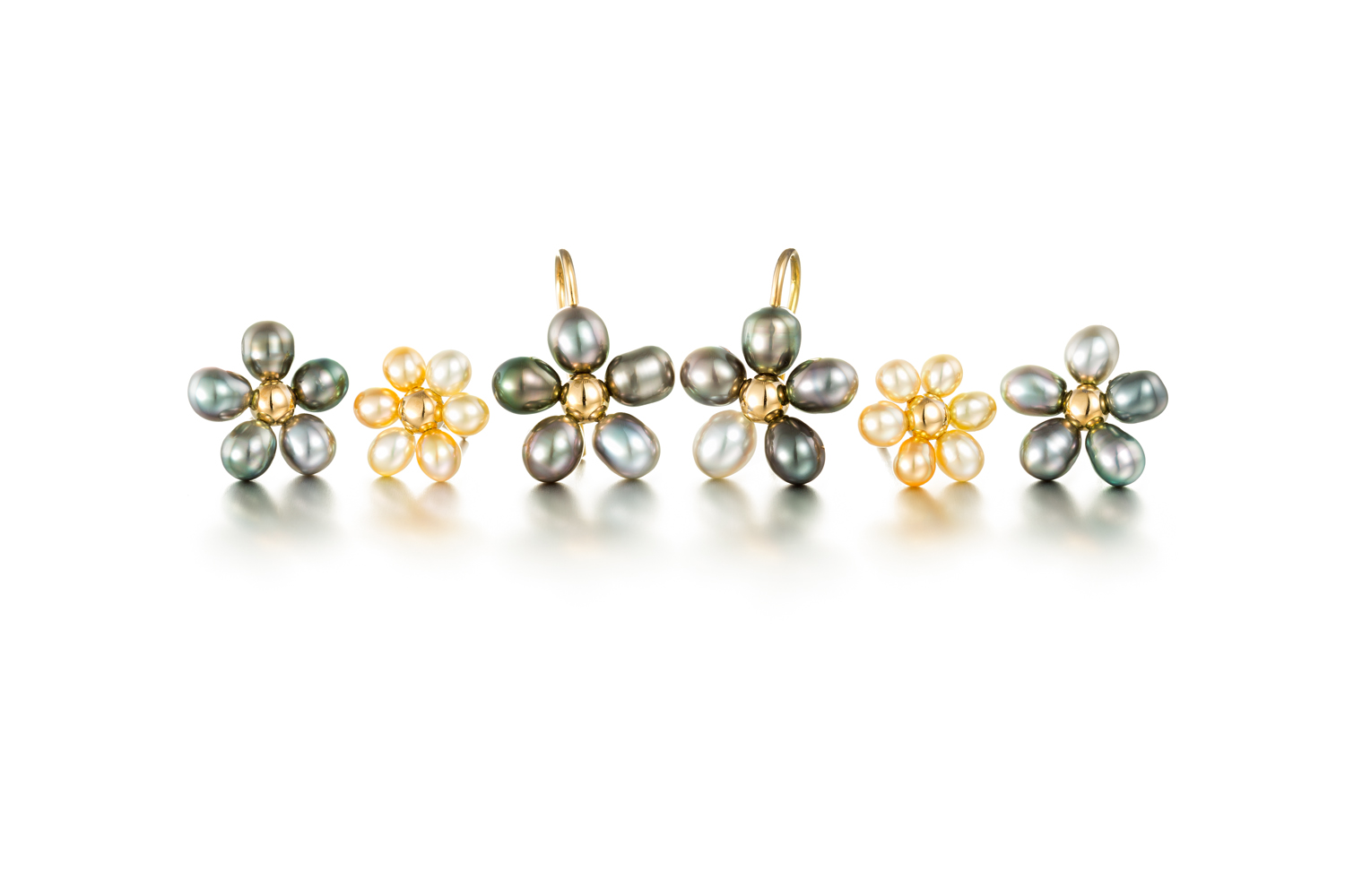 Flower earrings made from small South Sea Keshi pearls. These feminine earrings are suitable for both children and adults. Keshi pearls come in white, yellow and different shades of gray.