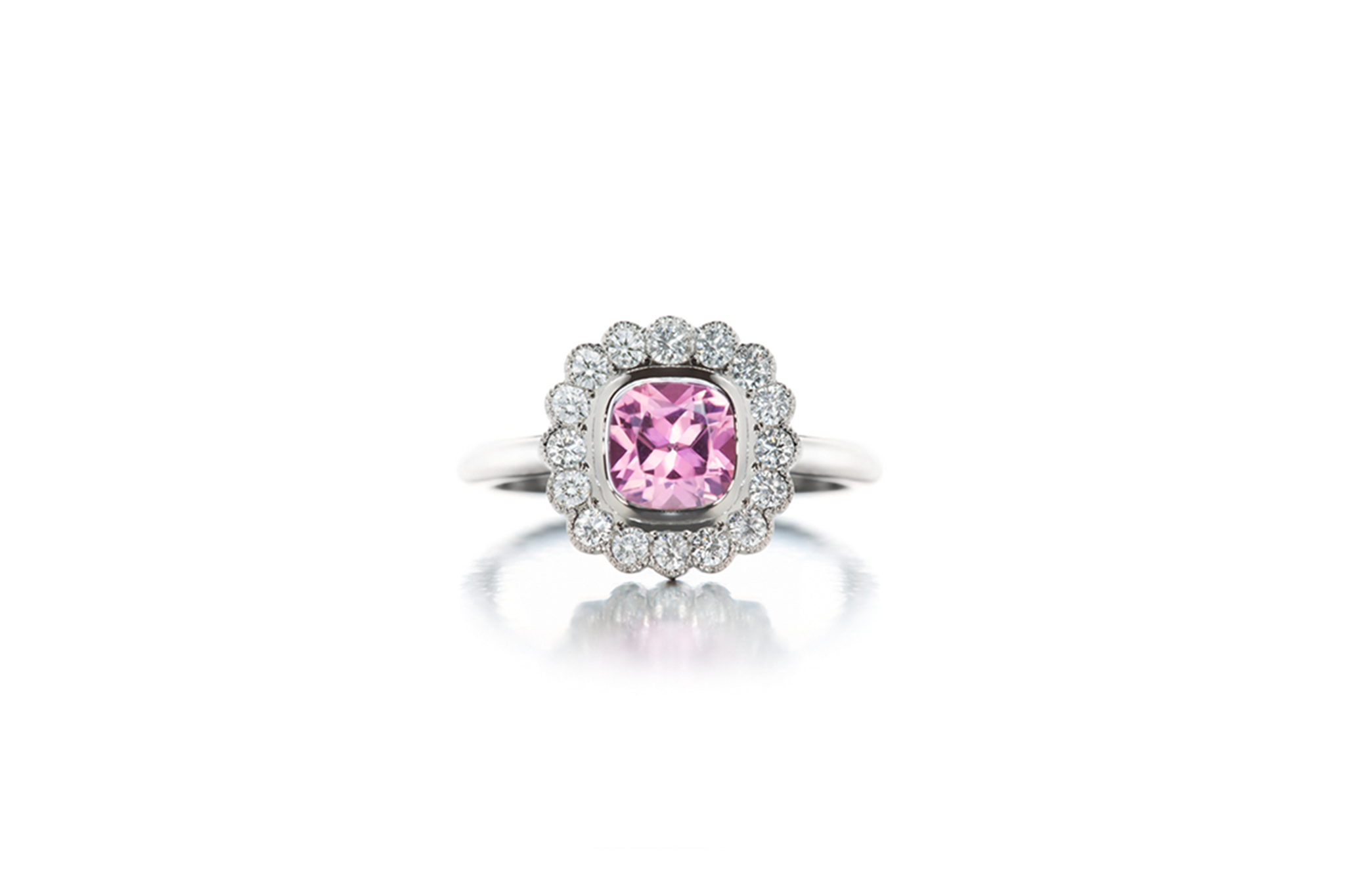 The classic carmosiér ring model was developed in the 1920s. In the ring, a row of diamonds circles around the center stone. Today, the model is commonly referred to as a halo ring. The center stone can be a colored stone or a classic diamond. The ring in the picture has a pink sapphire as the center stone and brilliant-cut diamonds around it.