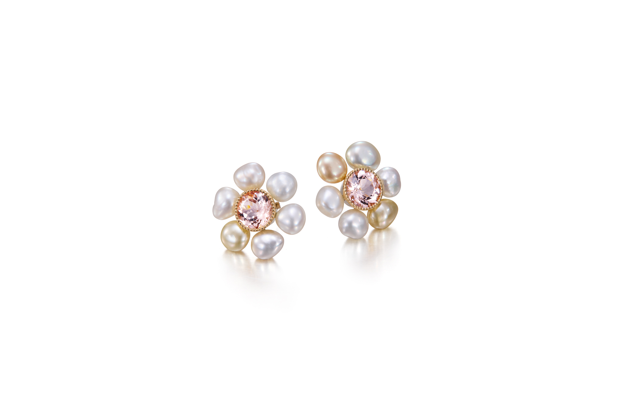 Timeless floral jewelry never fades. These delightfully feminine stud earrings feature South Sea Keshi pearls as petals and a 5.04ct pink morganite at the center. The earrings are crafted in yellow gold and have a wide backing expertly handcrafted in our workshop. The broader back provides support and balance, allowing the earrings to sit more comfortably on the ear. A perfect addition to your summer outfit. Entirery crafted by hand in Helsinki.