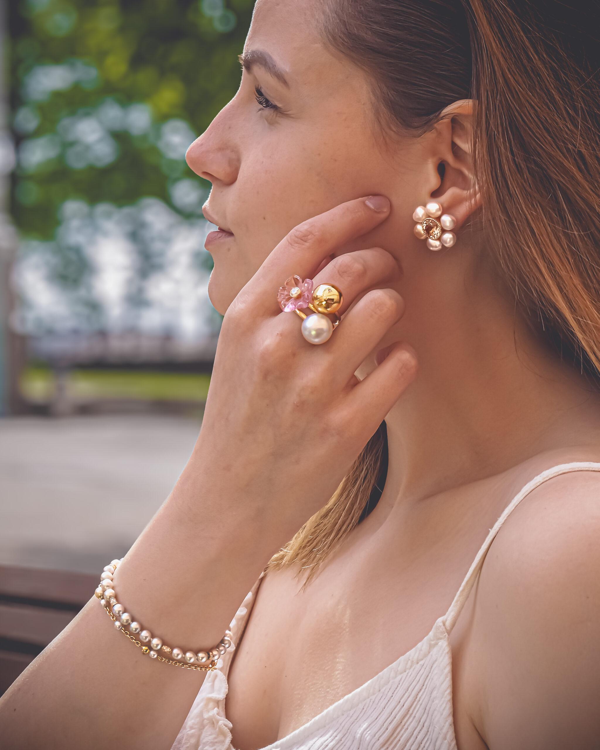 | Stones | Pink morganites tot. 5.04ct, South Sea keshi pearls |
