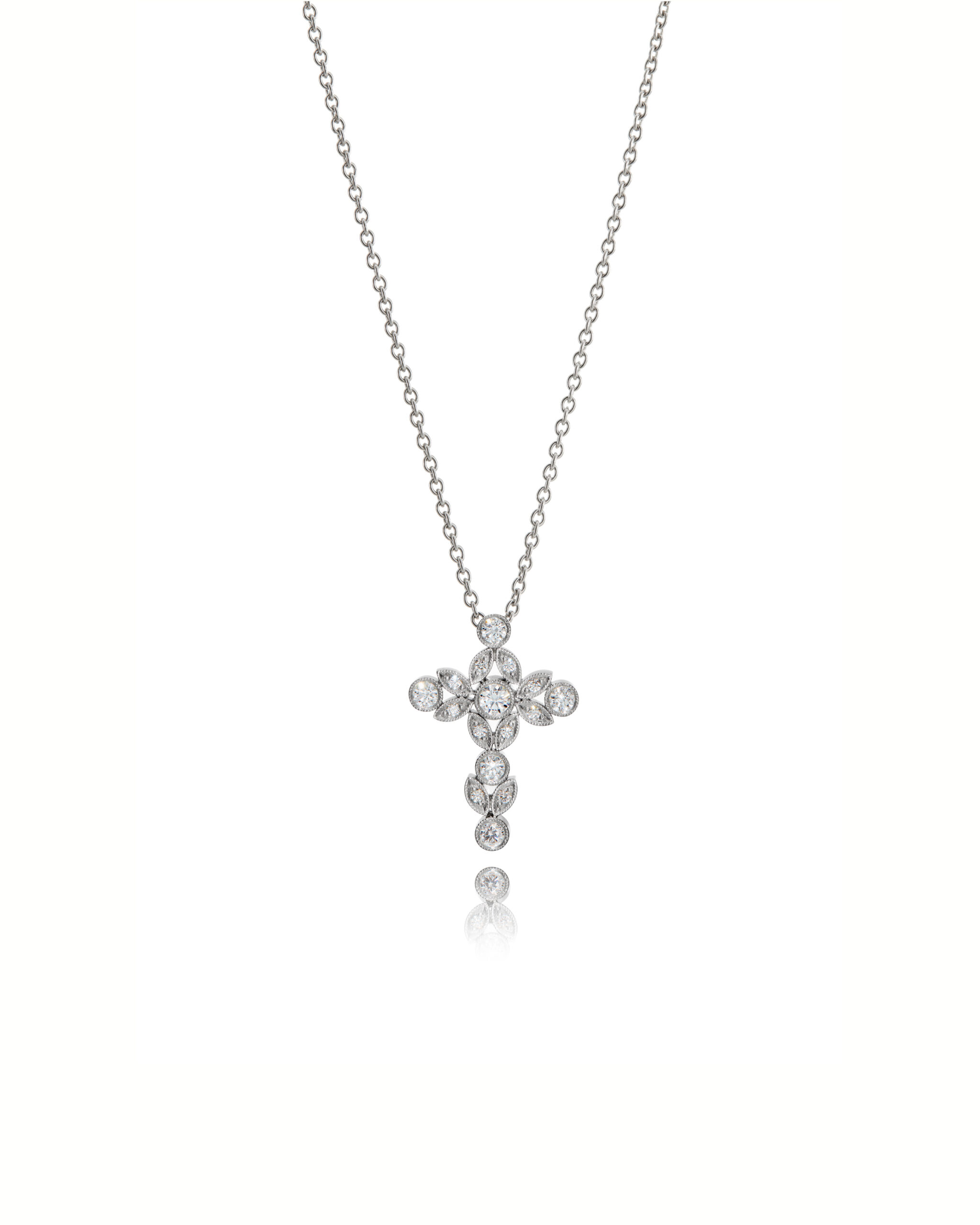 In the Braided Lives diamond cross pendant, the brilliant-cut diamonds are set in a milgrain setting and arranged in a floral, interlaced pattern, creating a piece that is both delicate and expressive. This refined, intricately detailed cross is designed for a woman who has already blossomed—or is just beginning to discover her inner self. Handcrafted in Helsinki by our finest goldsmiths.
