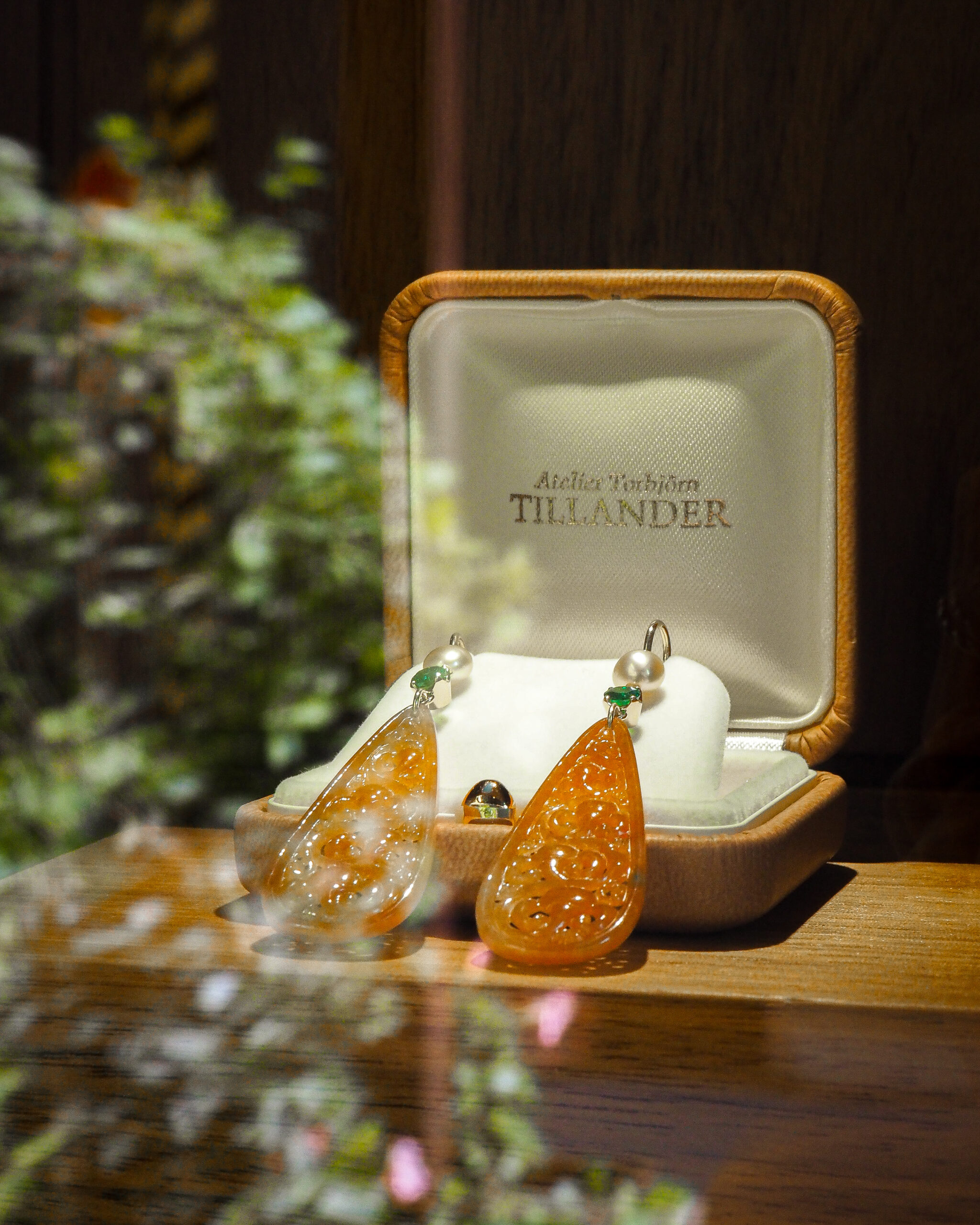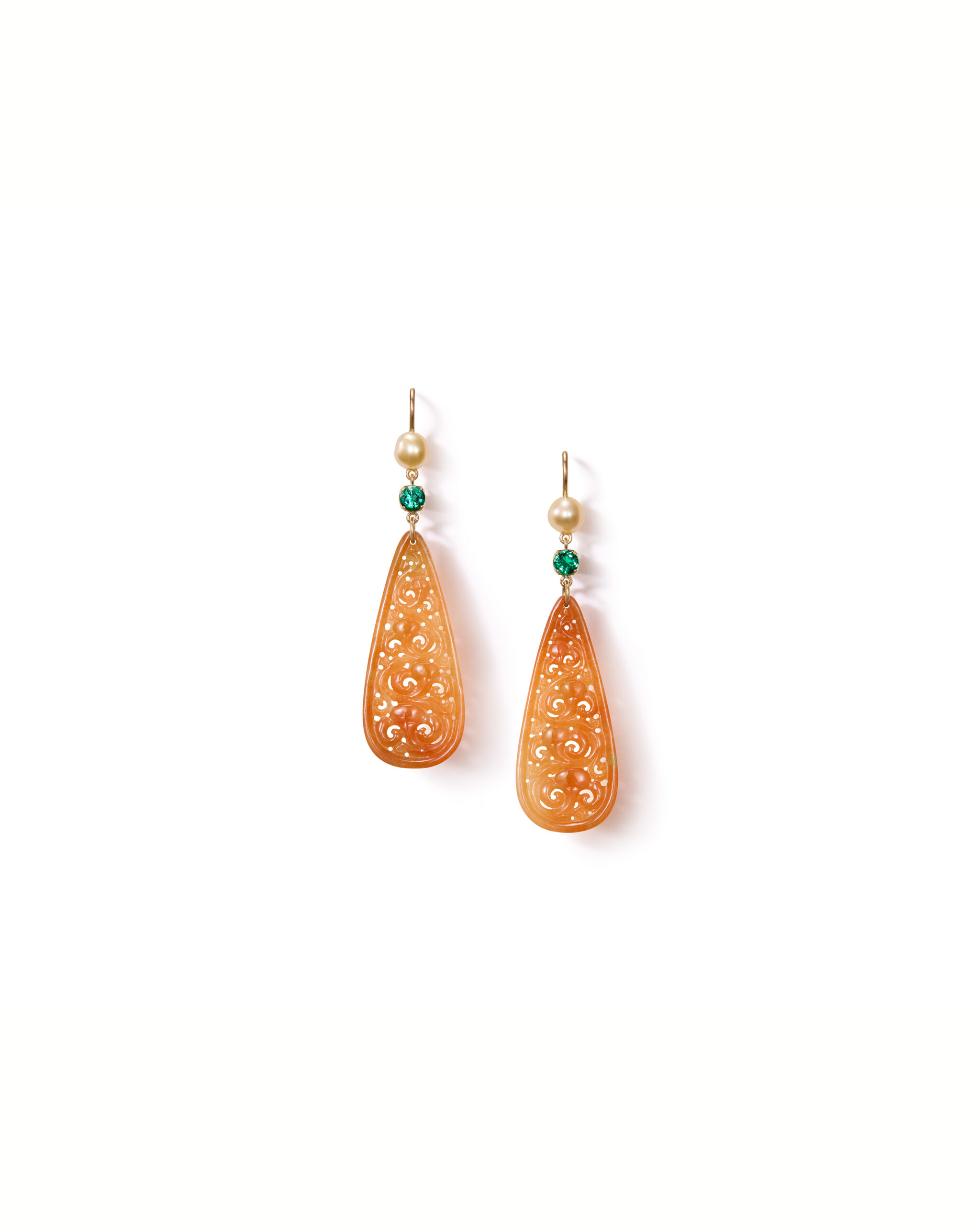 Elegant yet full of character, these jadeite earrings illuminate your face with a soft, warm glow. Their warm, orange-toned jadeites are artfully paired with vivid green Zambian emeralds and lustrous keshi pearls, creating a harmonious balance of color and texture. Each jadeite is finely handcrafted with intricate ornamental detail, adding depth and individuality. Measuring approximately 6 cm in length, they are lightweight and striking — the perfect statement for seasonal occasions or simply to brighten your day.