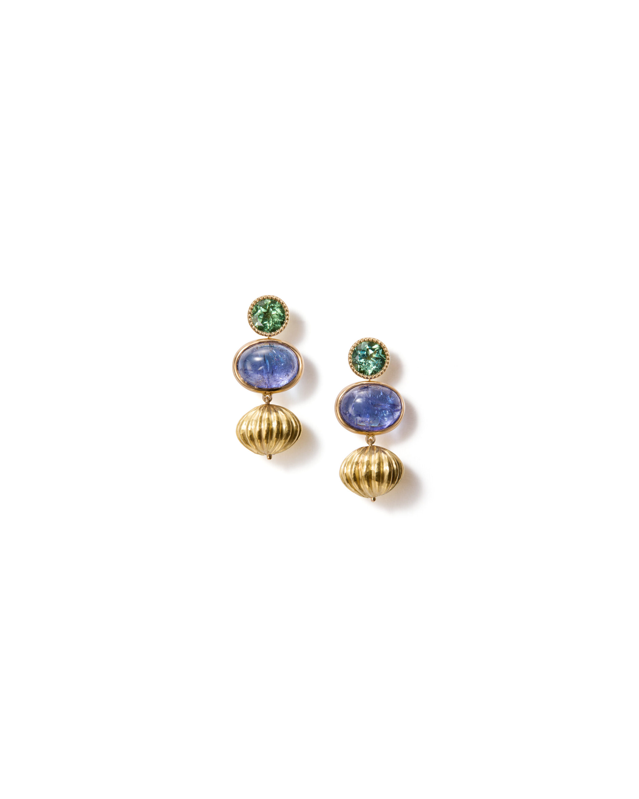 These earrings feature our newest pumpkin pieces alongside bluish-lilac tanzanites and beautiful green tourmalines. Tanzanite is found only in a single location on Earth, near Mount Kilimanjaro in Tanzania. Tanzanite is a December birthstone, along with zircon, turquoise, and blue topaz. Tourmaline again offers one of the widest color ranges of any gem species, appearing in virtually every hue, and it is the birthstone of October.