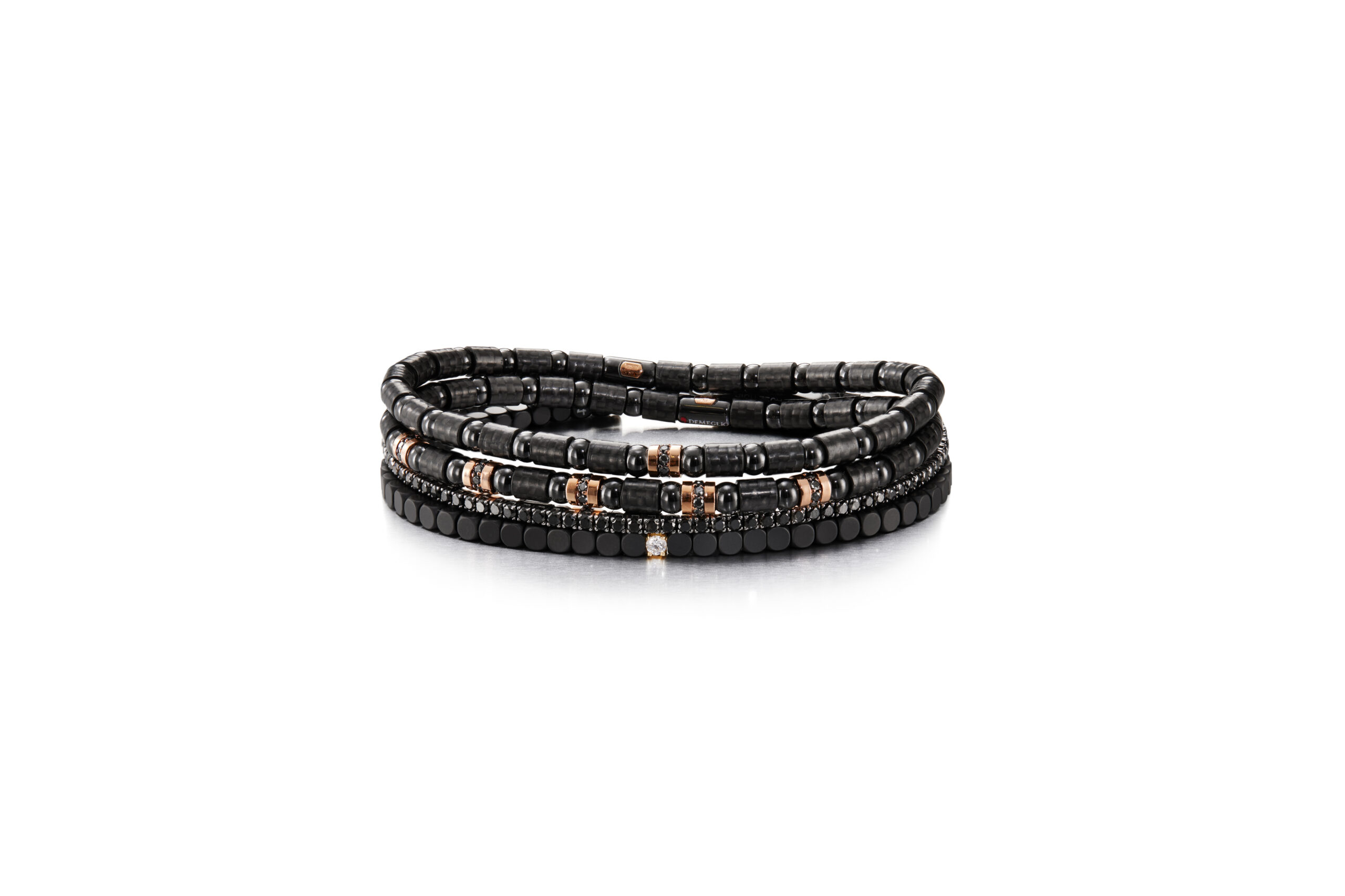 The photo is shown four bracelet, each reflecting different sense of style. The top bracelet features black diamonds 0.08ct, the one below it features red gold and black diamonds 0.40ct. The third bracelet is made of red gold and black diamonds 2.95 ct. All three bracelets are made with a stretch technique and don’t have a clasp. The bottom bracelet is made of stiff black high-tech ceramic with a white diamond set in yellow gold. 0.06 ct. This bracelet is open in the back for an easy way to put on and take off.