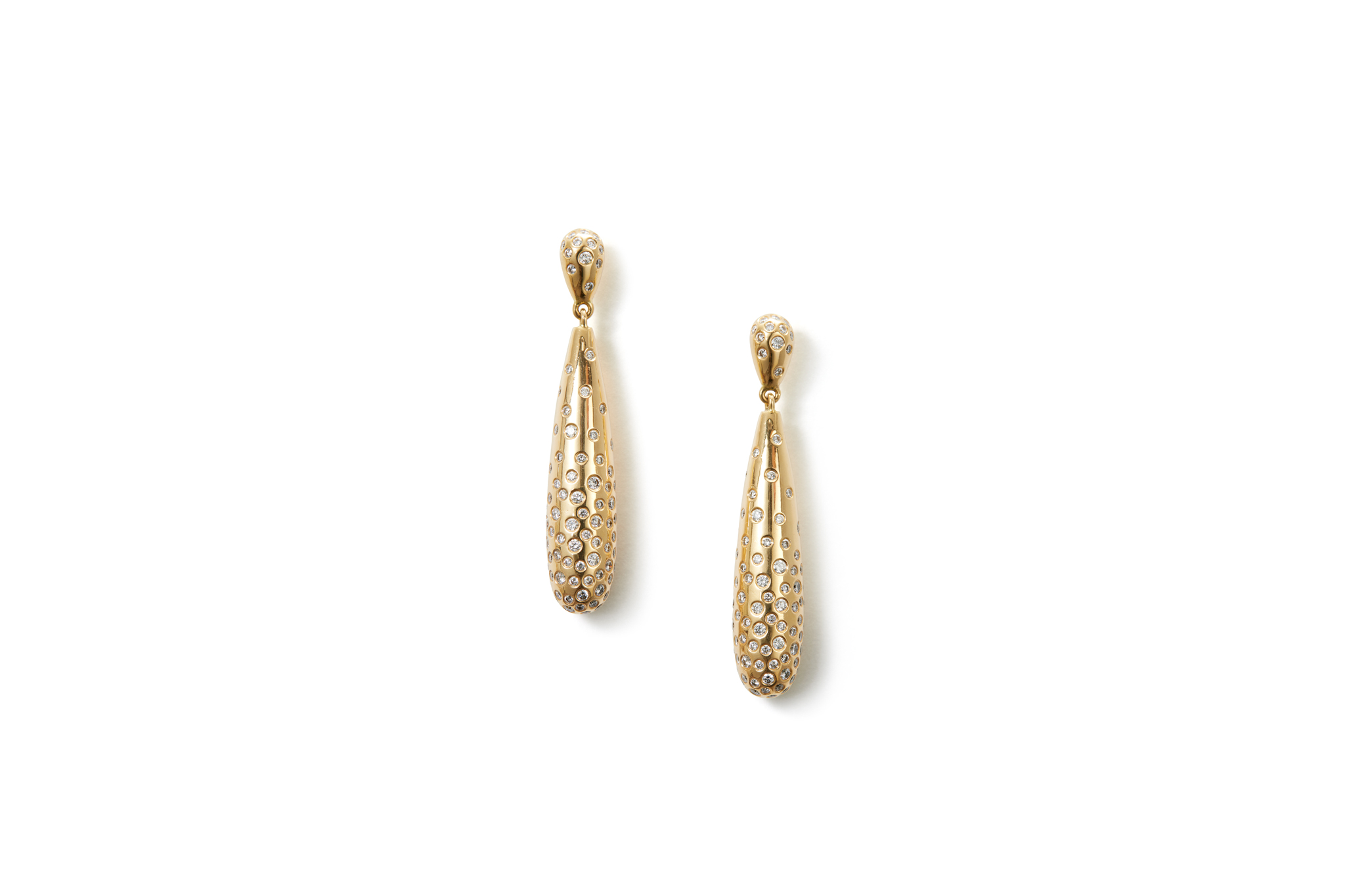 Luxurious dangling diamond stud earrings. The warmer red tone in the gold provides a soft contrast to the bright diamonds.