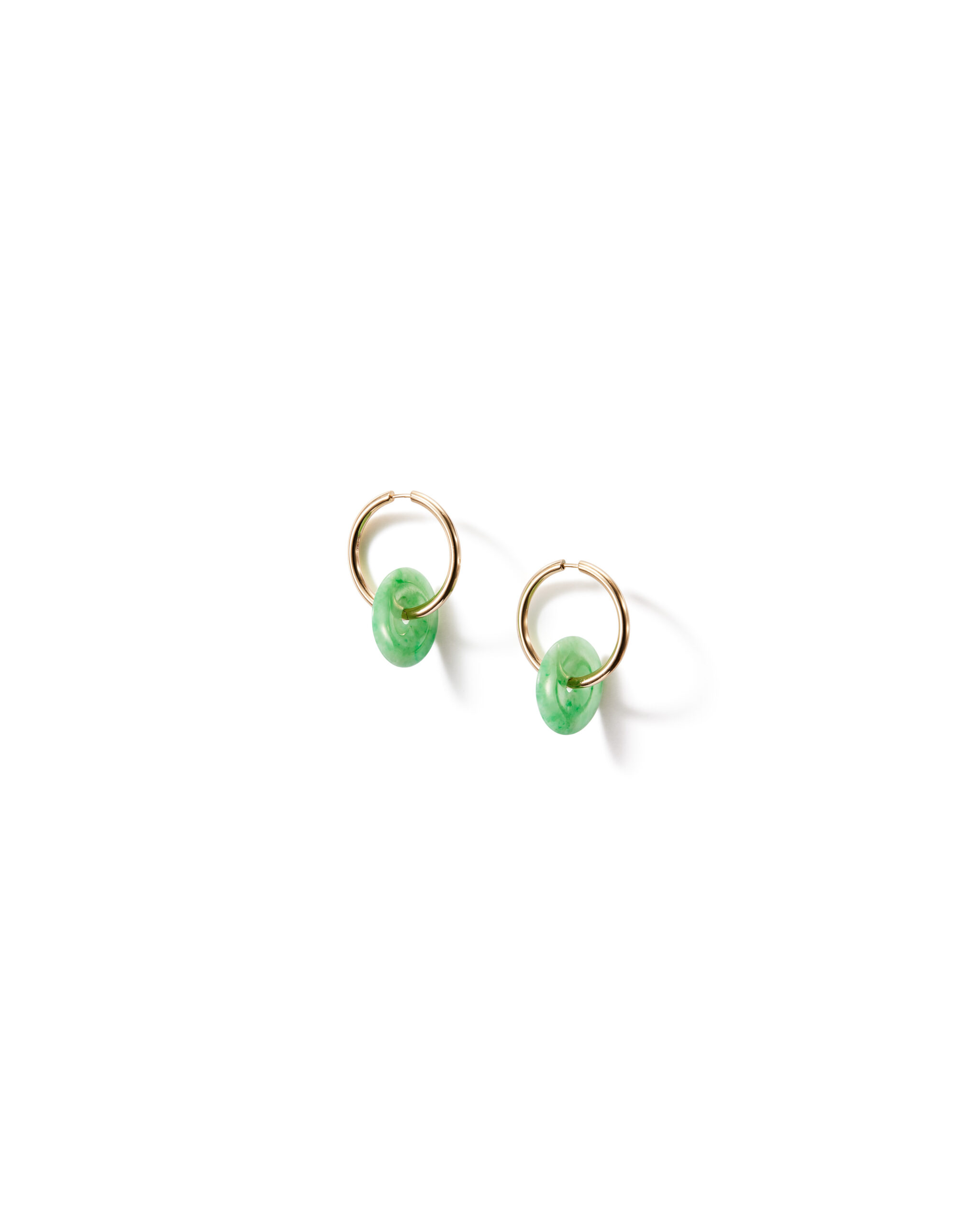 These 30mm gold hoops are a reliable wardrobe staple. Wear them as is, or pair them with our dingels for a playful twist. Green jadeites add a pop of color and character to the look. Explore your style, fall in love, and wear them proudly—before your daughter claims them.