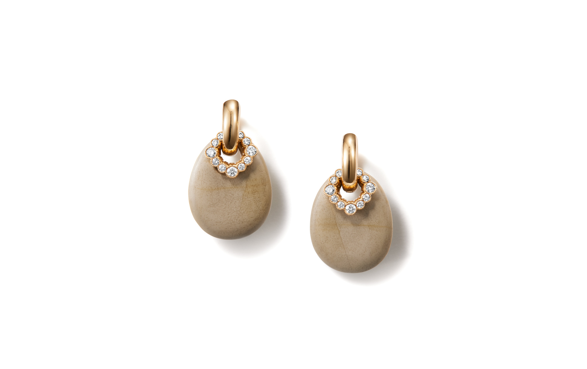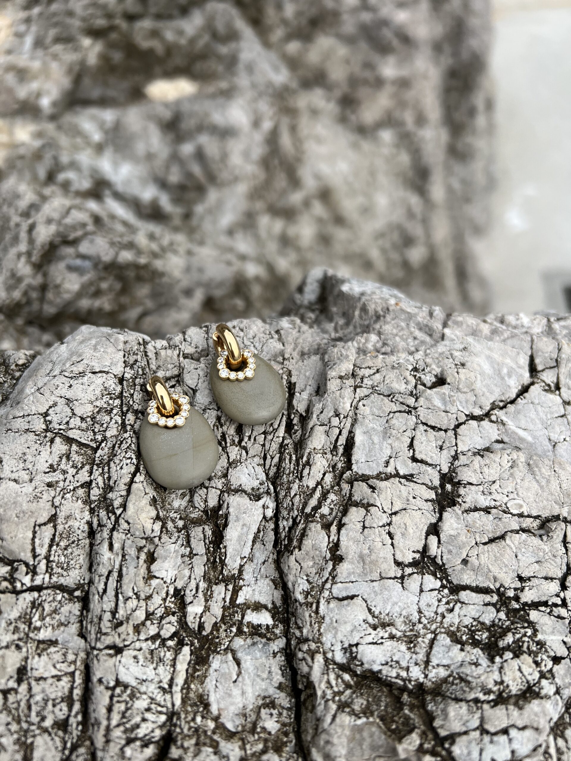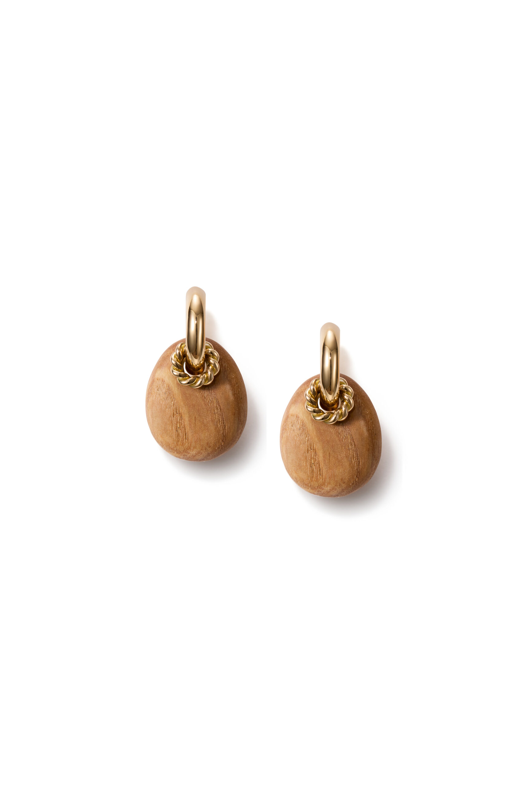 The Dingel gold hoops meet an earthy oval, lava stone or a add on made of wood. The hoops can be enhanced with an optional twisted golden Bondie Halo add-ons for subtle contrast and depth, or a delicate diamond Halo add-on for a touch of understated sparkle. A composition that feels effortless, allowing natural beauty to shine while offering a hint of sophisticated luxury. The elements are sold separately: hoops, lava stone/add on made of wood and add-ons.