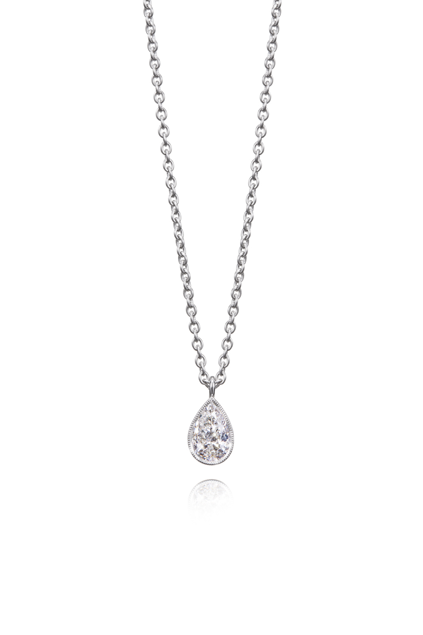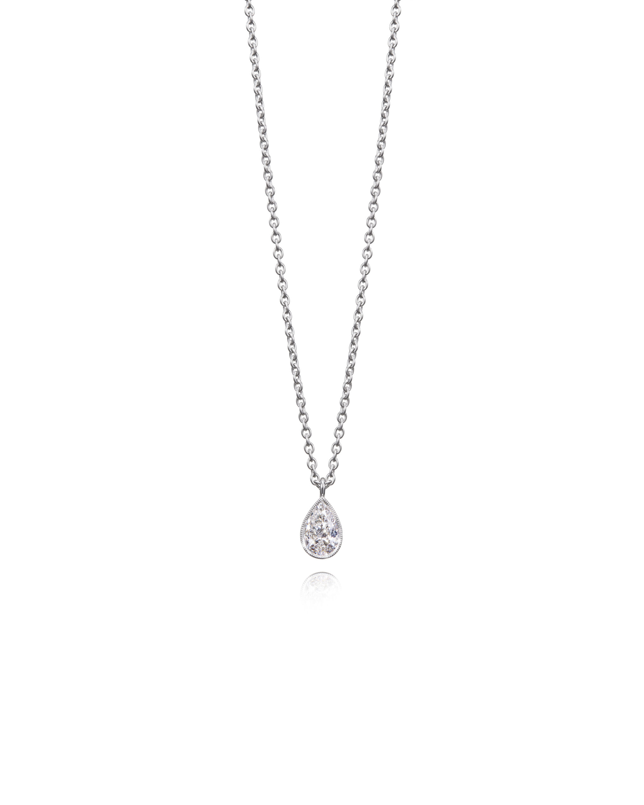 A stunning pendant featuring a drop-shaped diamond set in elegant white gold. Its gently flowing design carries you from day to day, catching the light with every movement and bringing a quiet, repeated delight to every moment.