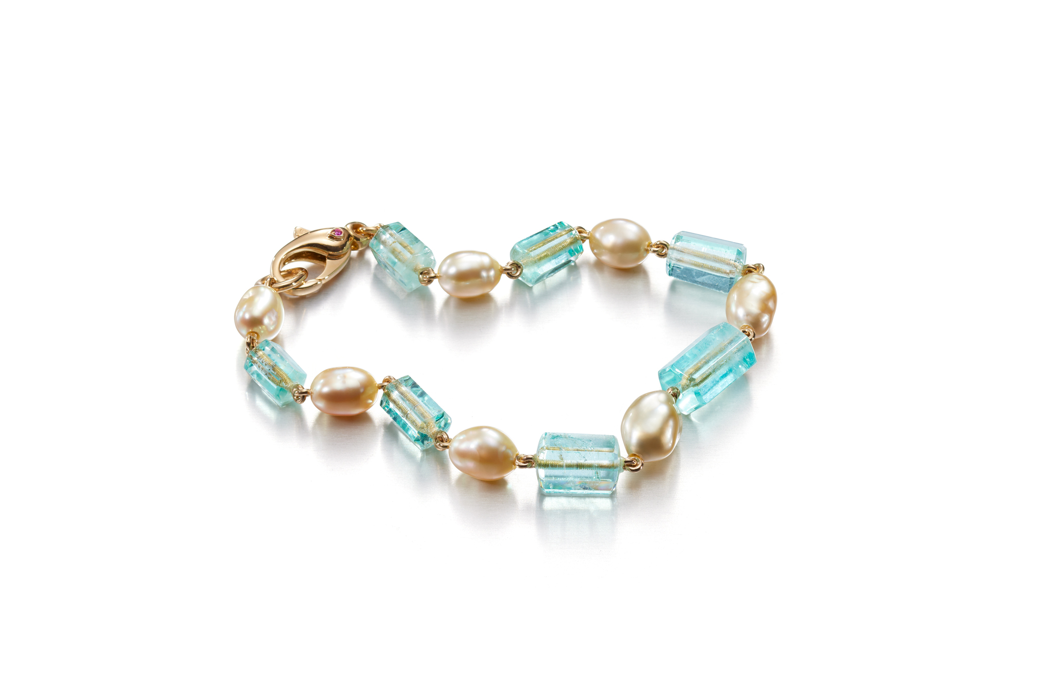 This bracelet captures a fleeting moment by the sea. Greenish-blue beryls echo the calm depth of open waters, while golden-hued keshi pearls reflect sunlight dancing on the surface. Each pearl is a natural, one-of-a-kind treasure — shaped by the sea, just as the sea shapes them.