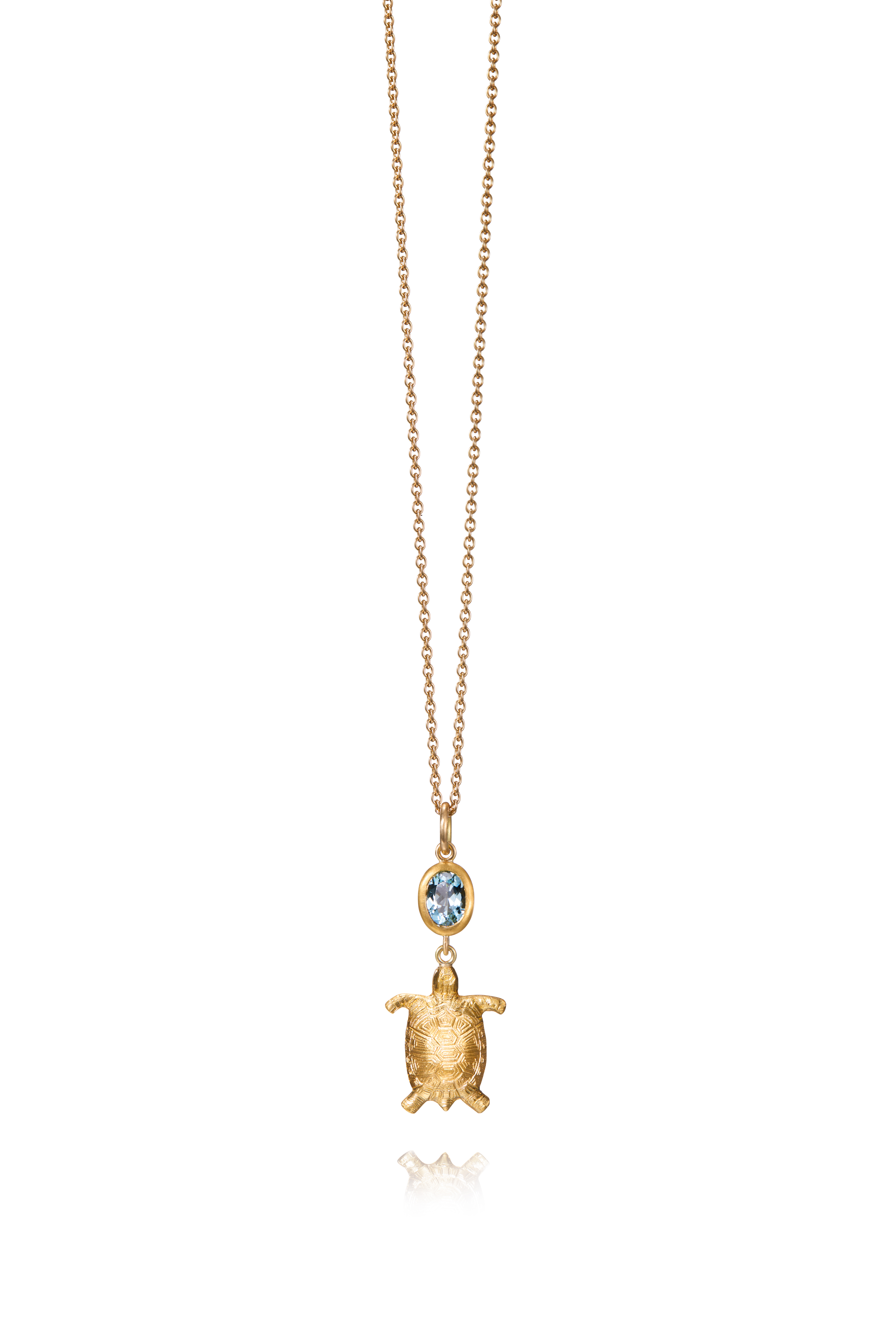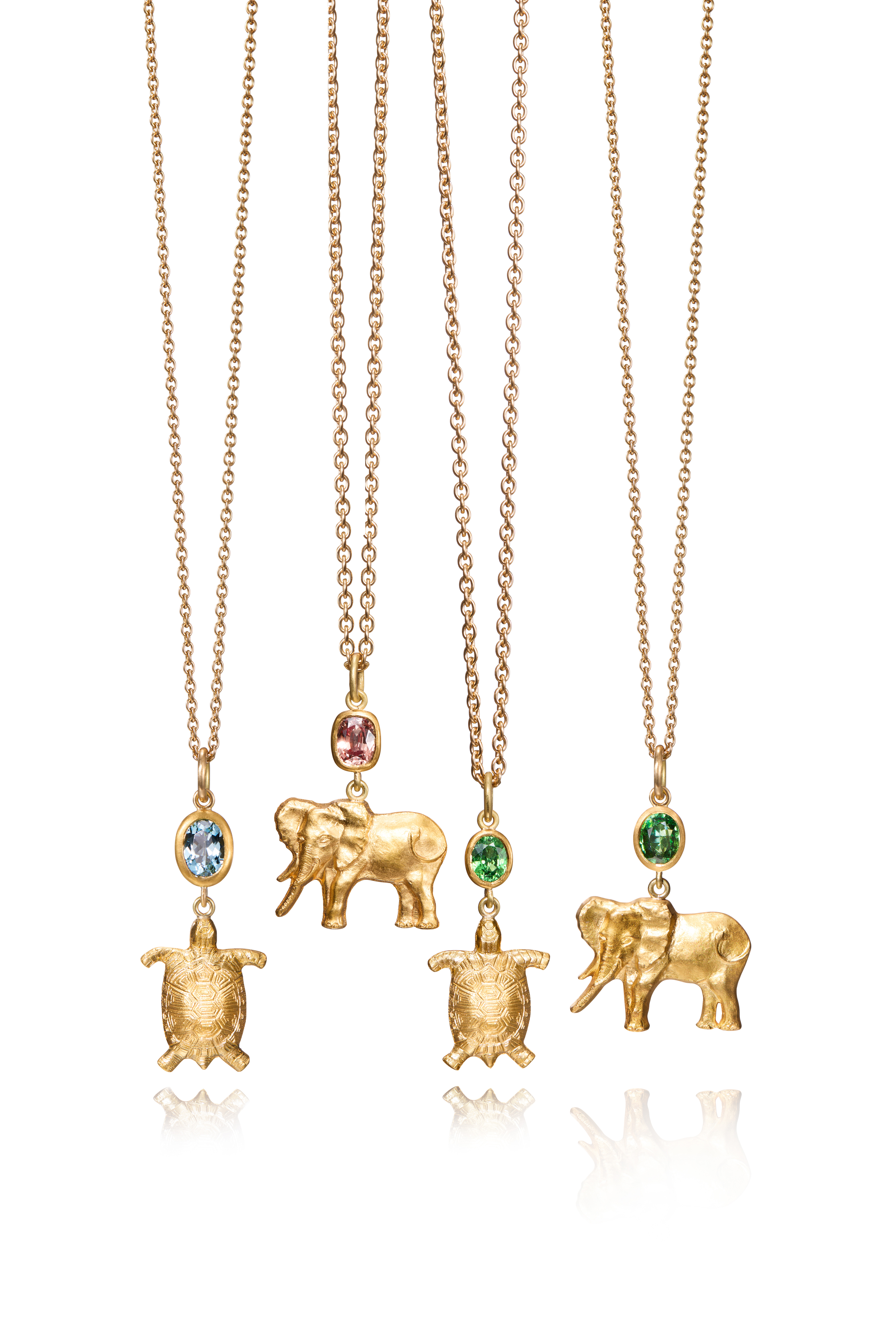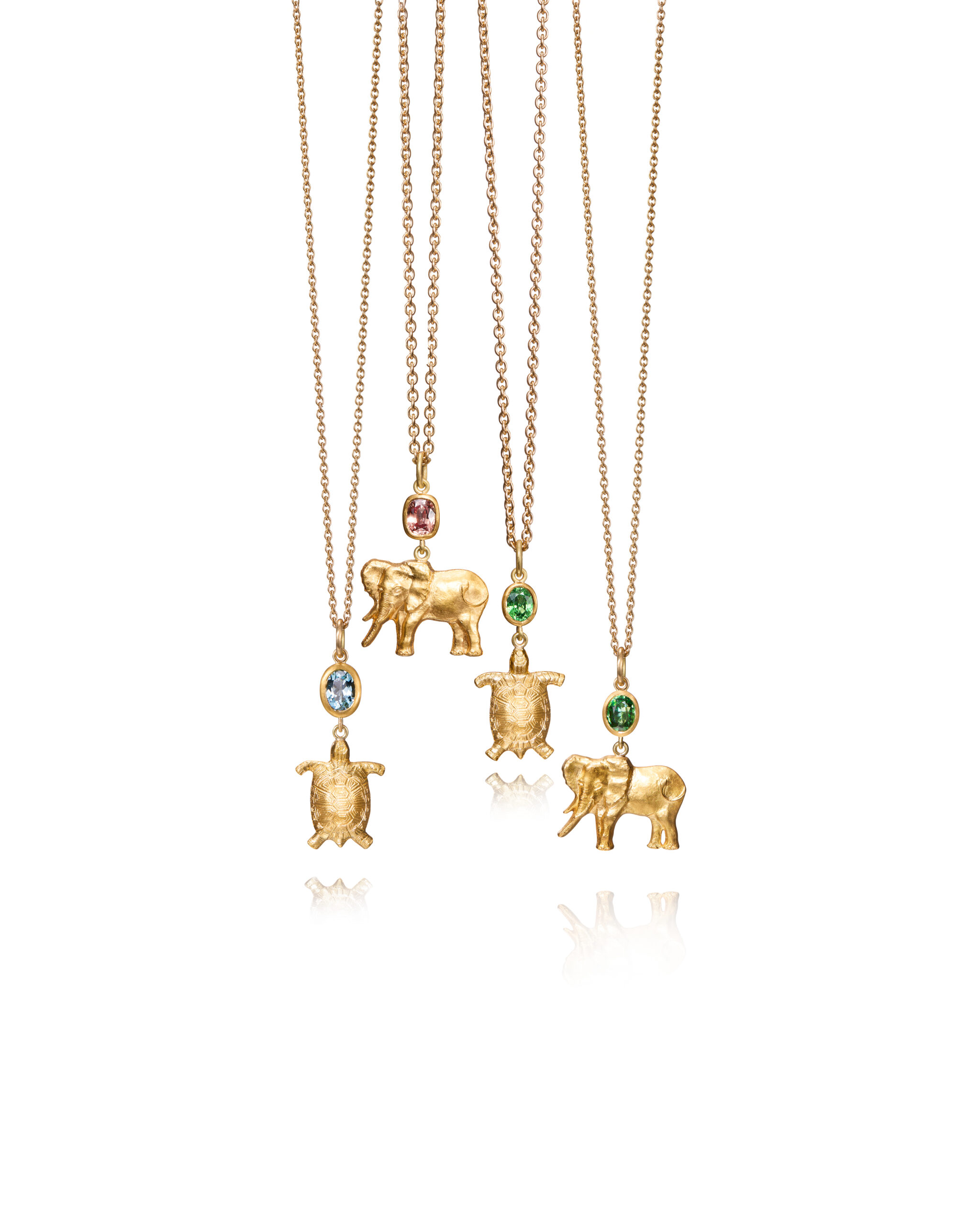 The turtle with an oval aquamarine and the elephant with an oval tsavorite available in-store. The chain is sold separately.