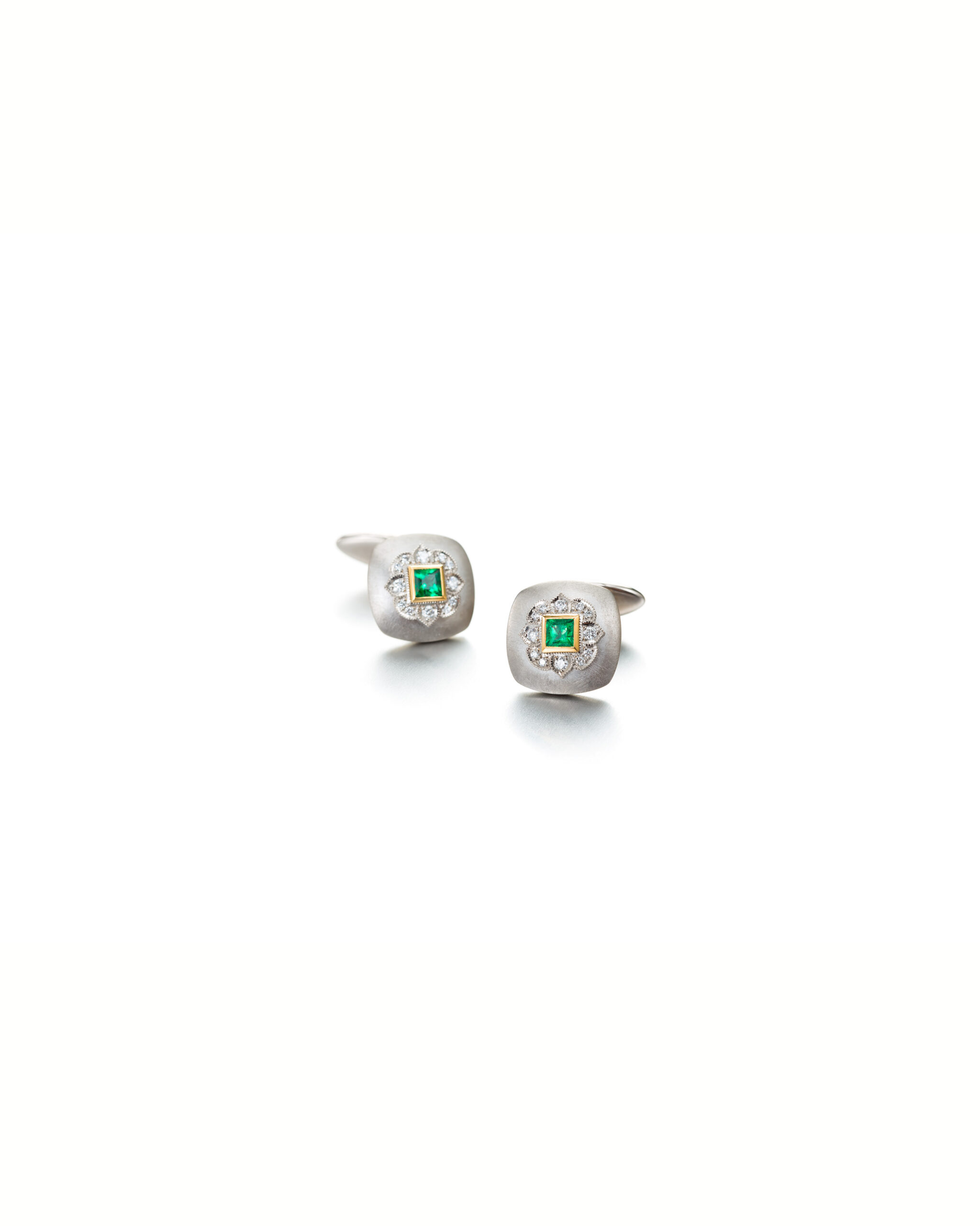 These white gold diamond cufflinks with bright emeralds are the face of a festive look. Not every man has the courage and sense of style to carry these with honor and pride. If you seek an accessory that does justice to your important occasion, these emerald cufflinks make a statement. Handcrafted by our finest goldsmiths in Helsinki.