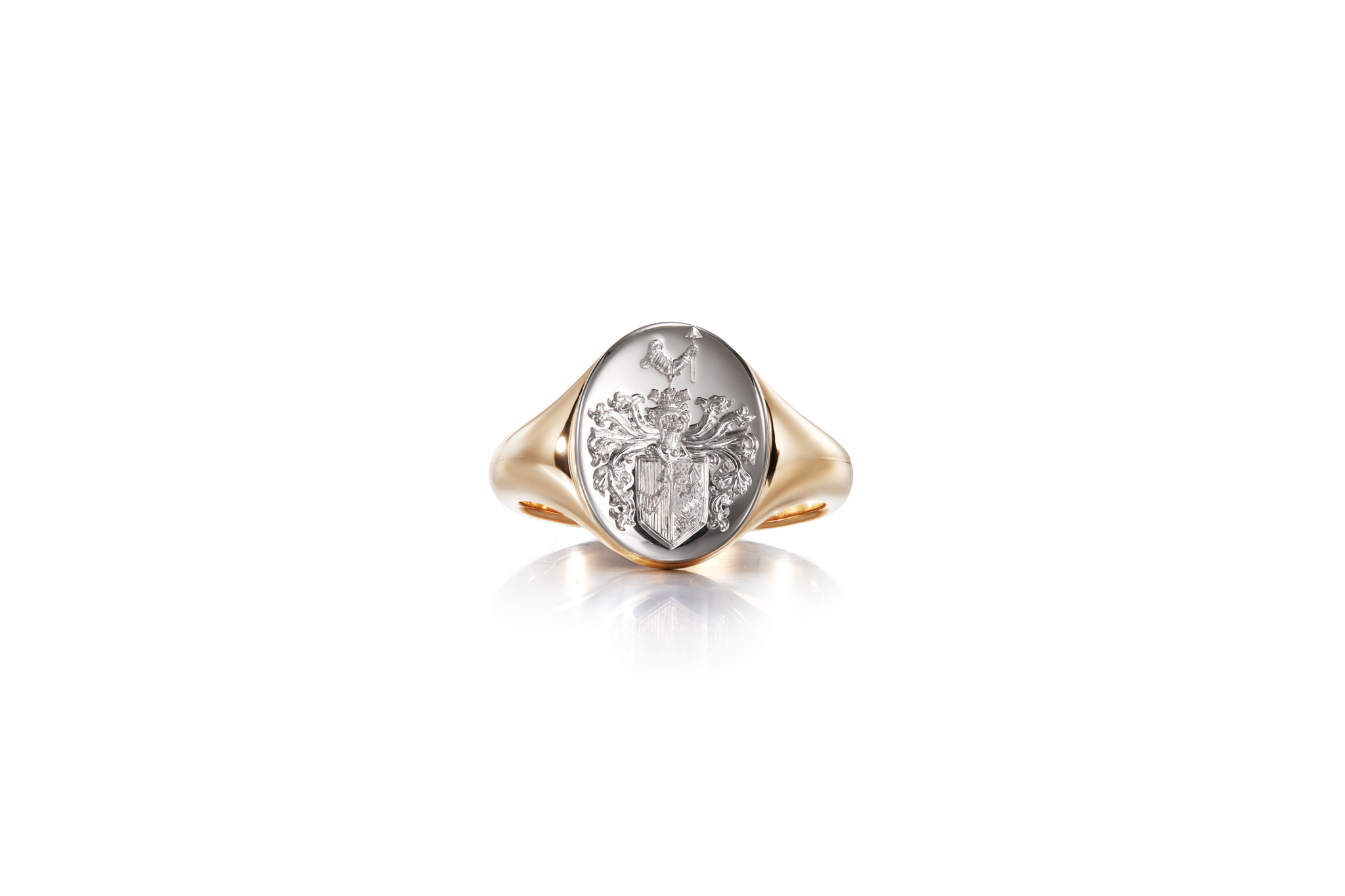 Modern and edgy coat of arms ring model made of 18k yellow and white gold. The family coat of arms is engraved directly into gold instead of stone. Handcrafted by our master goldsmith Janne Salminen.