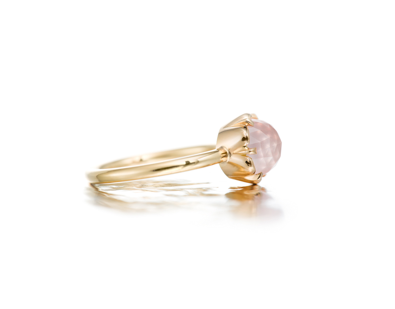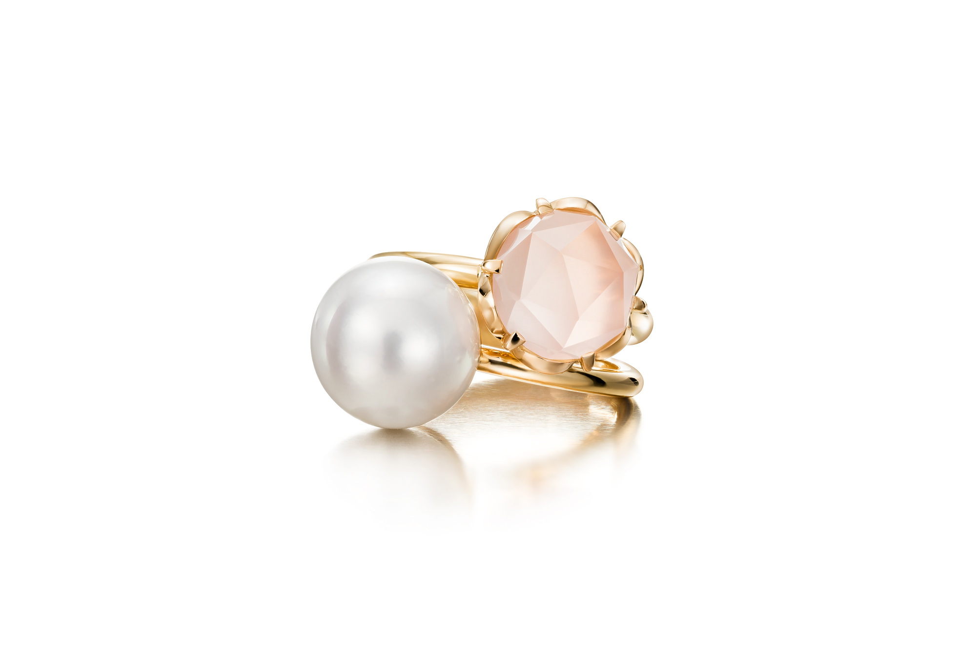 This rose quartz ring is available to purchase in white gold. The delivery time is approximately 3-4 weeks for a yellow gold version. The pearl rings are sold separately. With a starting price of €1,300.