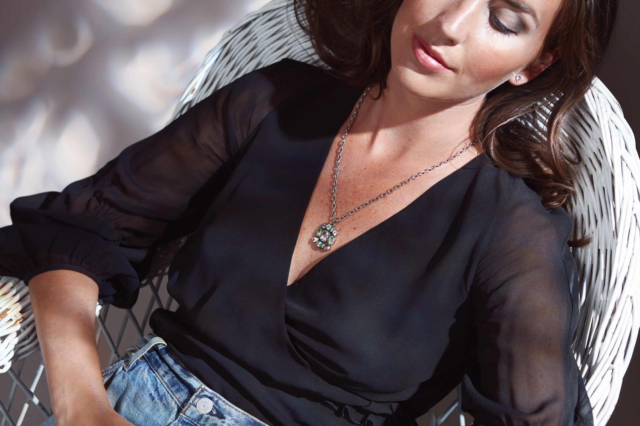 This exquisite, 1960s-inspired work of art — the Jackie pendant — shimmers in captivating shades of blue and green, illuminated by the brilliance of aquamarine, tourmalines, and sapphires. The necklace’s look can be effortlessly personalized by pairing the pendant with chains of varying lengths. Chains are sold separately.