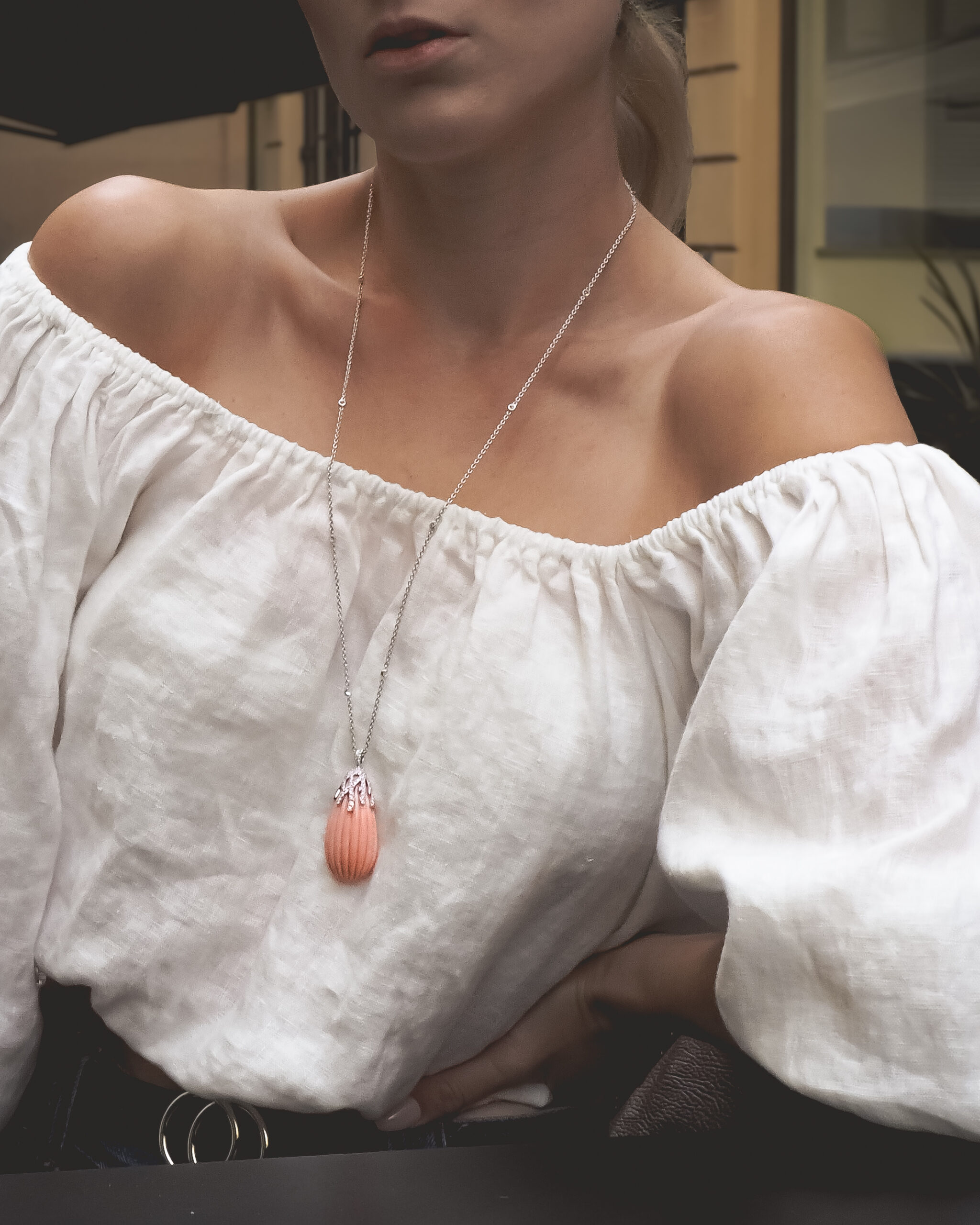 A unique and striking pendant handcrafted from genuine coral and diamonds. The coral, sourced from the Pacific Ocean, features a delicate Angel Skin Pink hue and weighs 17.5g. The pendant is adorned with diamonds set in white gold, extending all the way to the bail, with a total diamond weight of 0.684ct. The pendant measures approximately 5cm in length. It is complemented by a 70cm white gold brilliant-cut chain, featuring H/VS-grade diamonds totaling 10×0.10ct. The chain is sold separately.