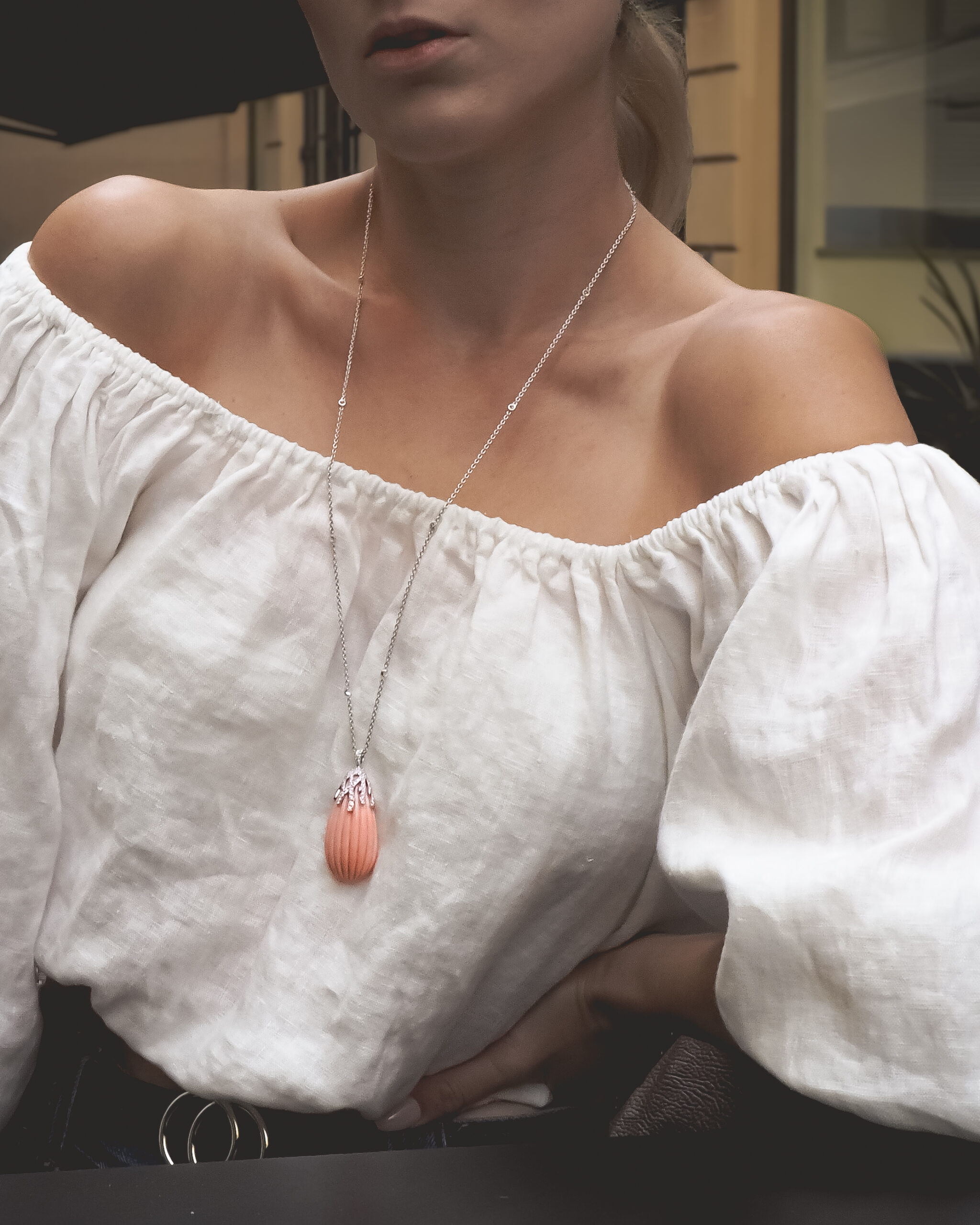 A unique and striking pendant crafted from genuine coral and diamonds. The coral, sourced from the Pacific Ocean, features a delicate Angel Skin Pink hue and weighs 17.5g. The pendant is adorned with diamonds set in white gold, extending all the way to the bail, with a total diamond weight of 0.684ct. The pendant measures approximately 5cm in length. It is complemented by a 70cm white gold brilliant-cut chain, featuring H/VS-grade diamonds totaling 10×0.10ct. The chain is sold separately.