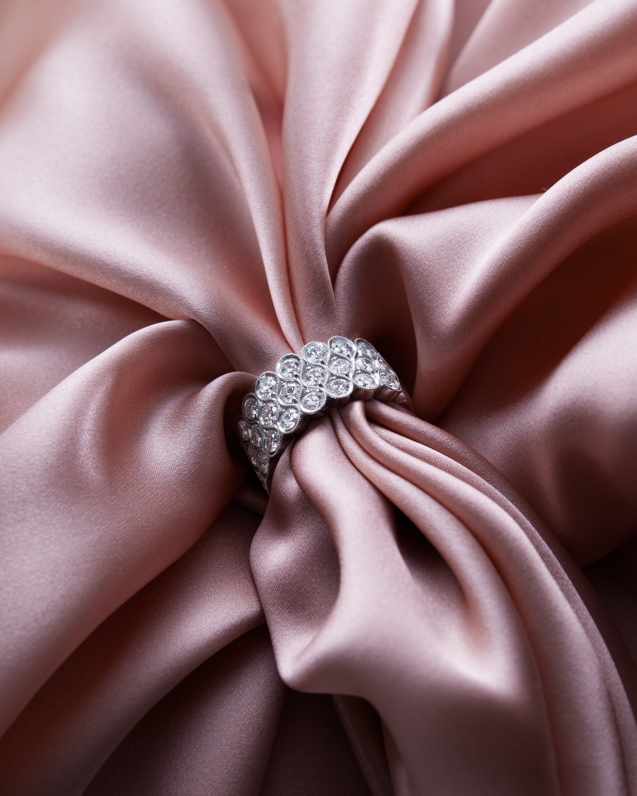 La Collerette – The design of the ring draws inspiration from the Victorian era’s ruched “la collerette” necklace. The dark color of the metal gives this half eternity diamond ring a hint of rock edge. The ring features brilliant-cut diamonds and can be made in full, half-eternity, or with two or three rows. Handcrafted by our finest goldsmiths in Helsinki.