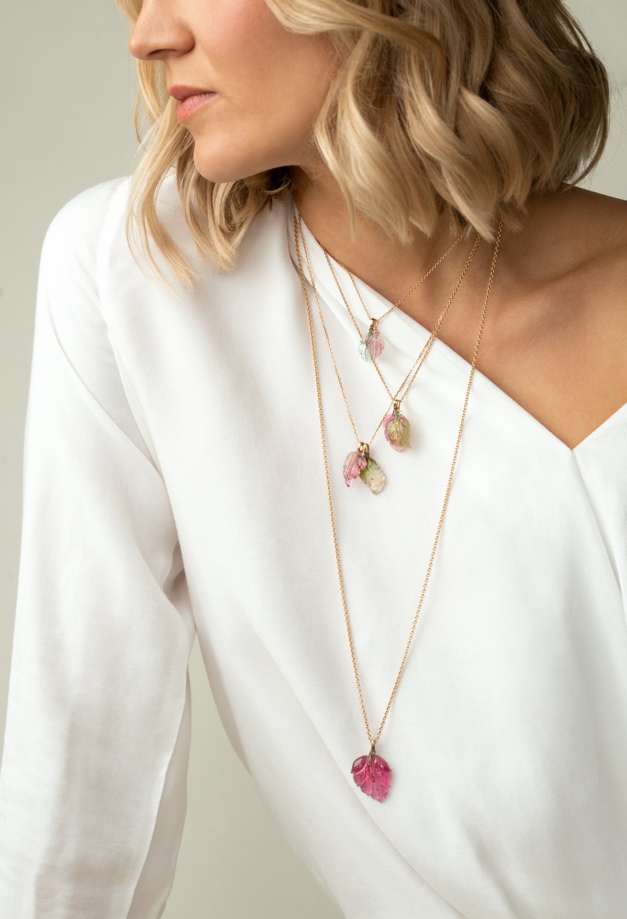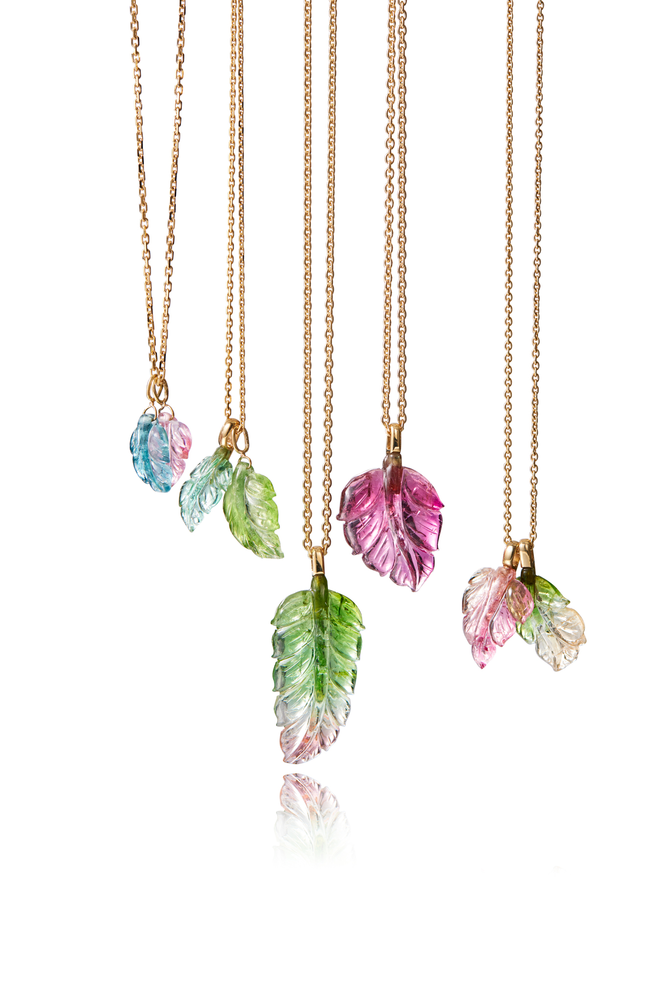 The Leaf Me Not pendant is for the woman who has it all. These beautifully carved tourmaline leaf pendants are available in different sizes. Combine several pendants for more vibrant look, or layer it with our Heritage pendant to add contrast to your look. Small variations include the two outermost pendants on the left side of the image, as well as the pendant on the right side. The big variations are the two pendants in the middle. Contact us via the request form to tell us the pendant of your choice.