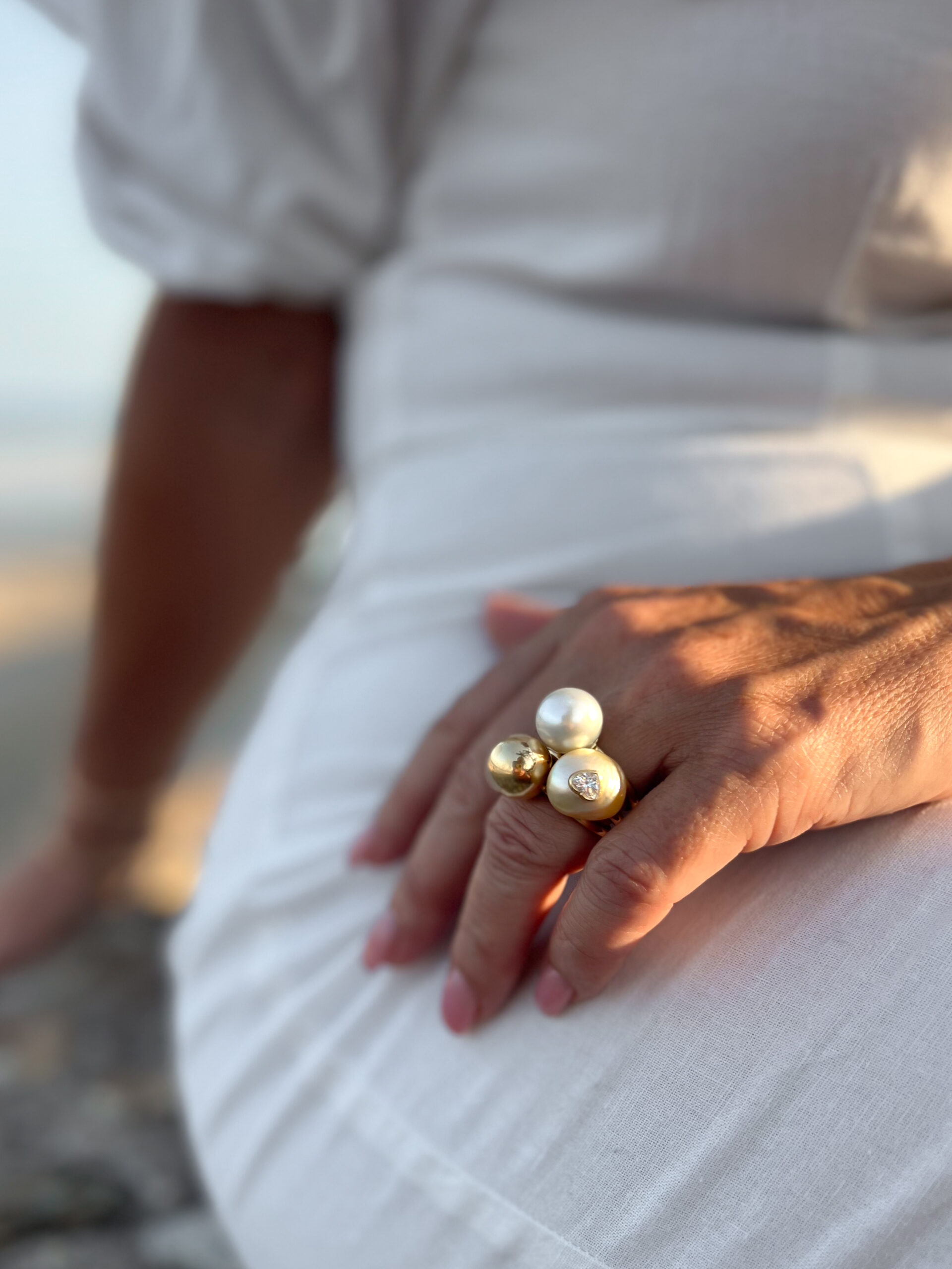 A unique pearl ring featuring a heart-shaped diamond embedded in the pearl. This ring symbolizes the deep love and bond between mother and daughter, making it a perfect gift. With its elegant design, it serves as a stunning piece of jewelry. Handcrafted by our master goldsmith Janne Salminen.