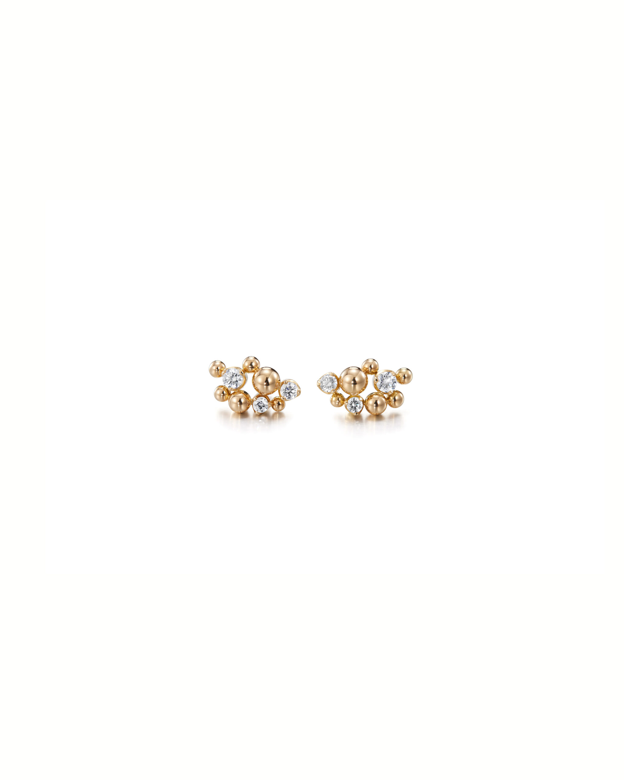 Elegant and playful, these earrings sit perfectly on the earlobe. A mix of sparkling diamonds and polished gold beads creates a dynamic, eye-catching design. Perfect for adding a touch of glamour to both everyday moments and special evenings out. Handcrafted by our finest goldsmiths in Helsinki