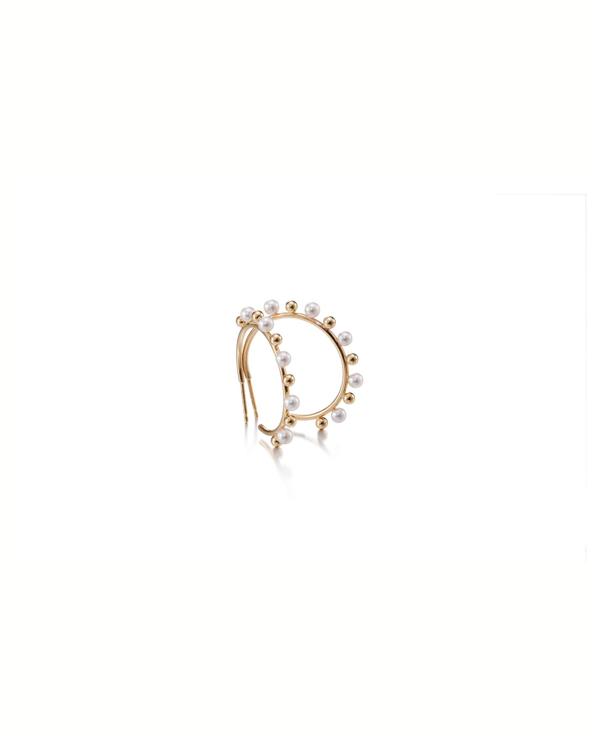 Akoya pearl and gold hoop earrings. Crafted in our workshop in central Helsinki from 750‰ gold, these earrings combine delicate natural colored Akoya pearls with gold beads for a timeless and elegant look. Lightweight and versatile, they bring subtle sophistication to both everyday outfits and special occasions. A perfect gift for yourself or someone you love.