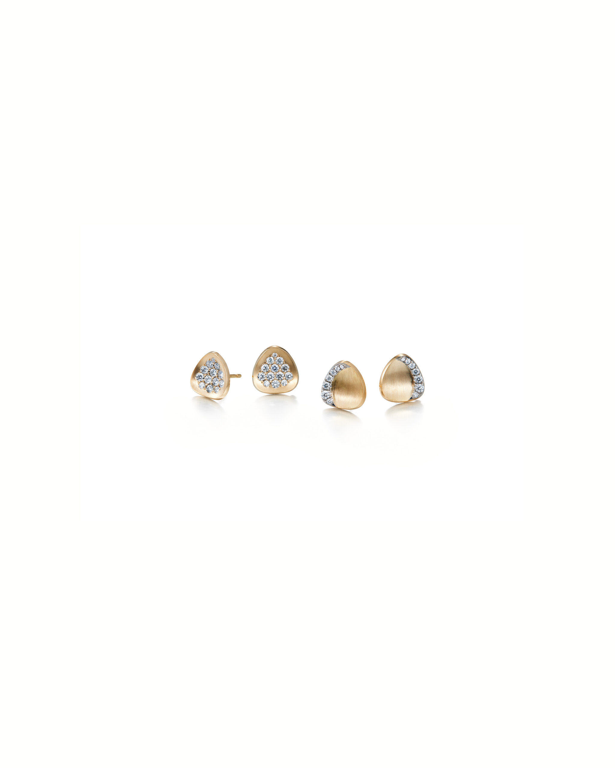 Soft triangle shaped gold stud earrings with diamonds. Perfect everyday jewels. They work as well at the office as they do for a late dinner with friends. Add a pair of pearl add-ons for a festive look. Handcrafted by our finest goldsmiths in Helsinki.