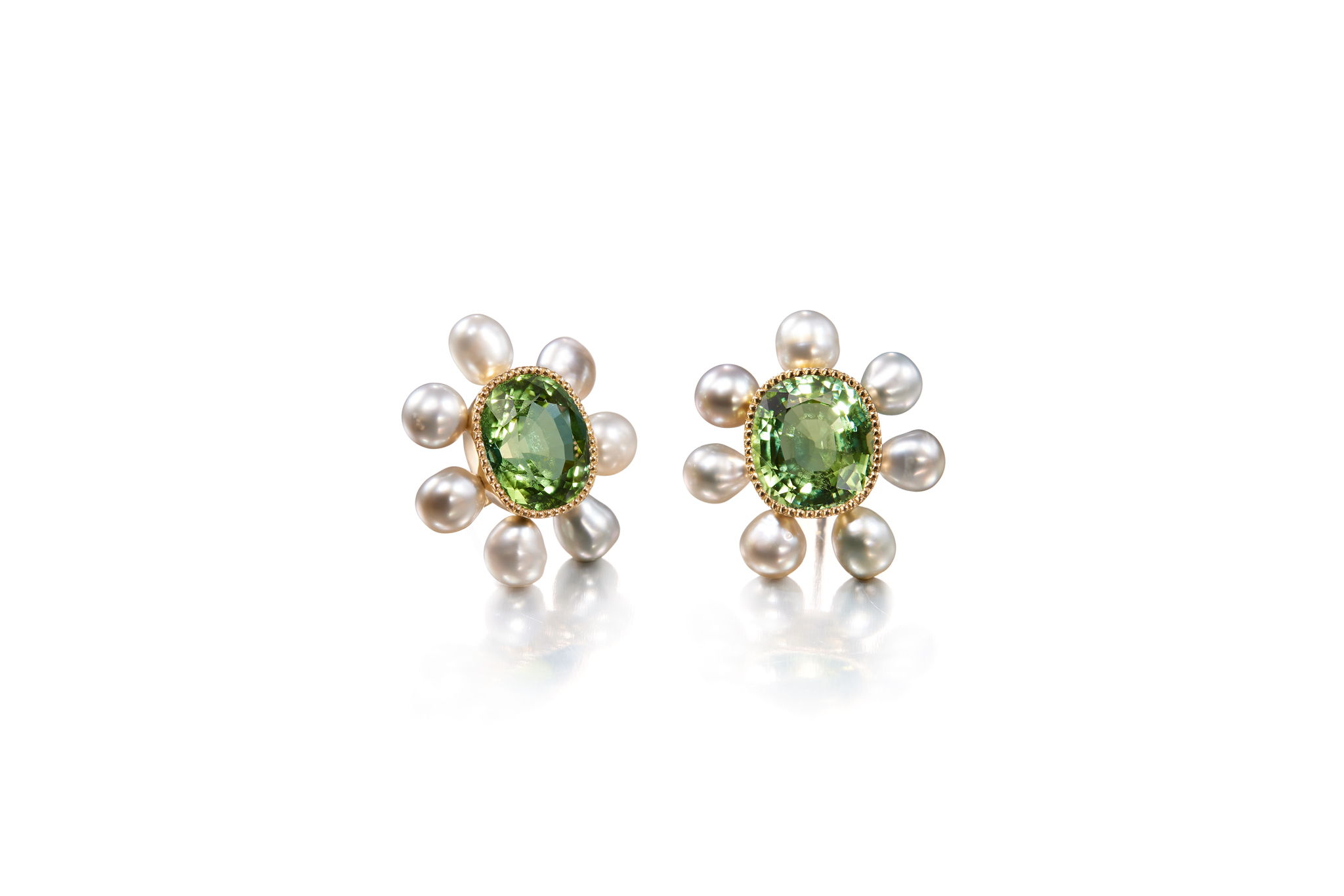 Bloom-inspired stud earrings that blend sculptural elegance with a touch of vintage charm. At the center sits a large, punched-set tourmaline glowing in fresh spring green, while delicate South Sea keshi pearls are arranged like airy, luminous petals. The result is a pair of earrings that feel both refined and delightfully whimsical — perfect for summer celebrations and any moment that calls for something truly eye-catching.