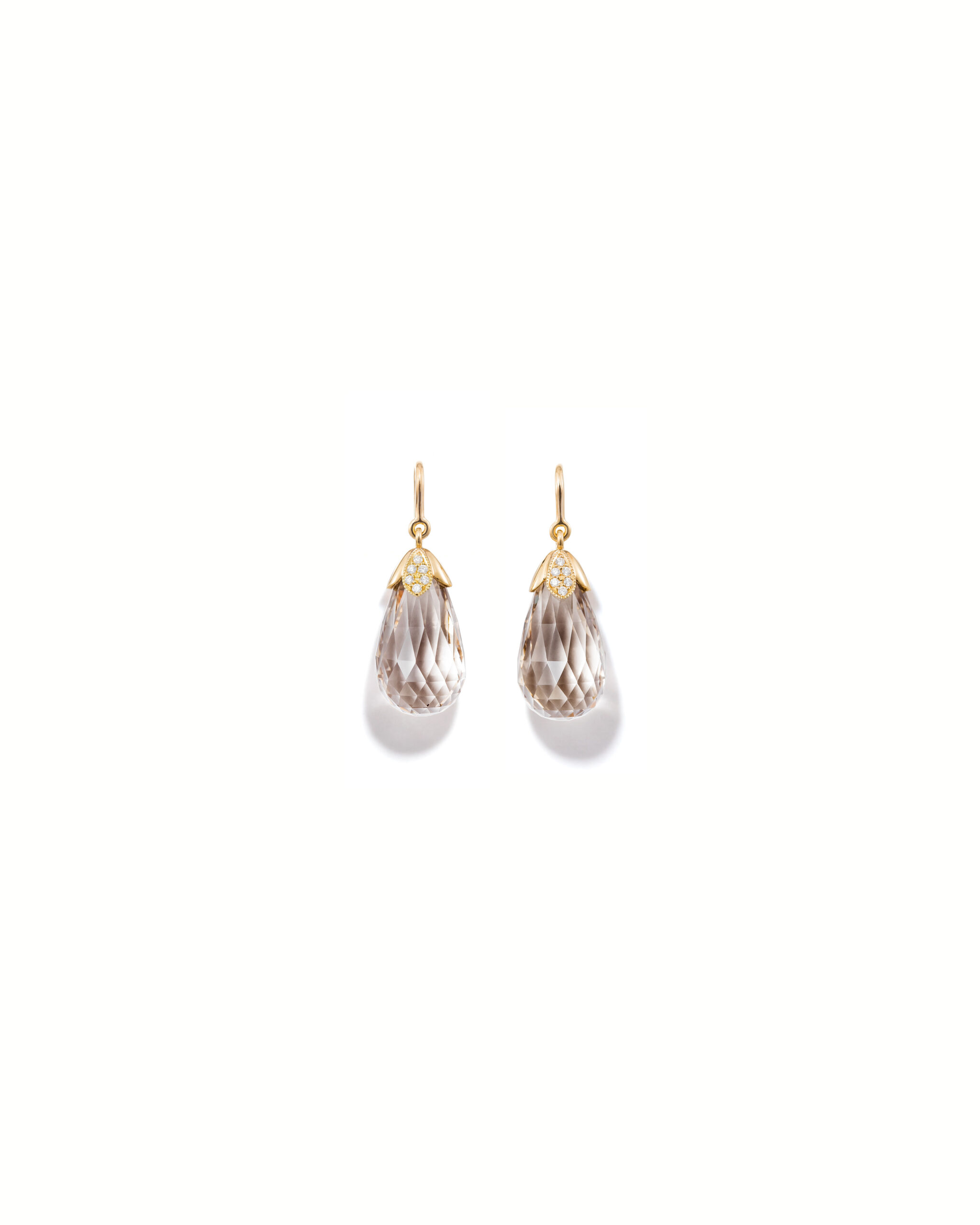 In the Pom Pom Quartz gold hook earrings with diamonds, the briolette-cut smoky quartz adds a soft, sophisticated glow. Effortlessly chic, it pairs perfectly with a turtleneck and a simple ponytail, letting the gentle movement and warm shimmer of the stone take center stage.
