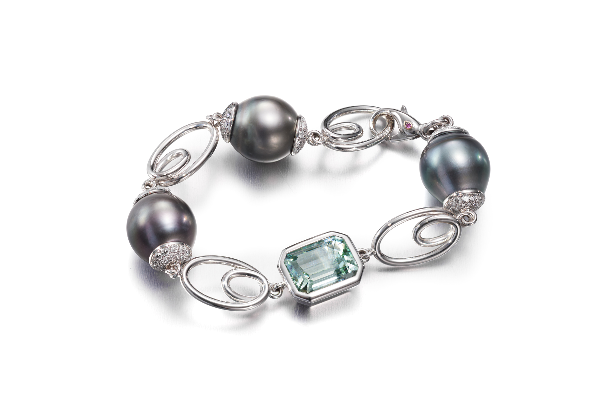 A Pearl Chain Bracelet with Beryl and Diamonds in White Gold