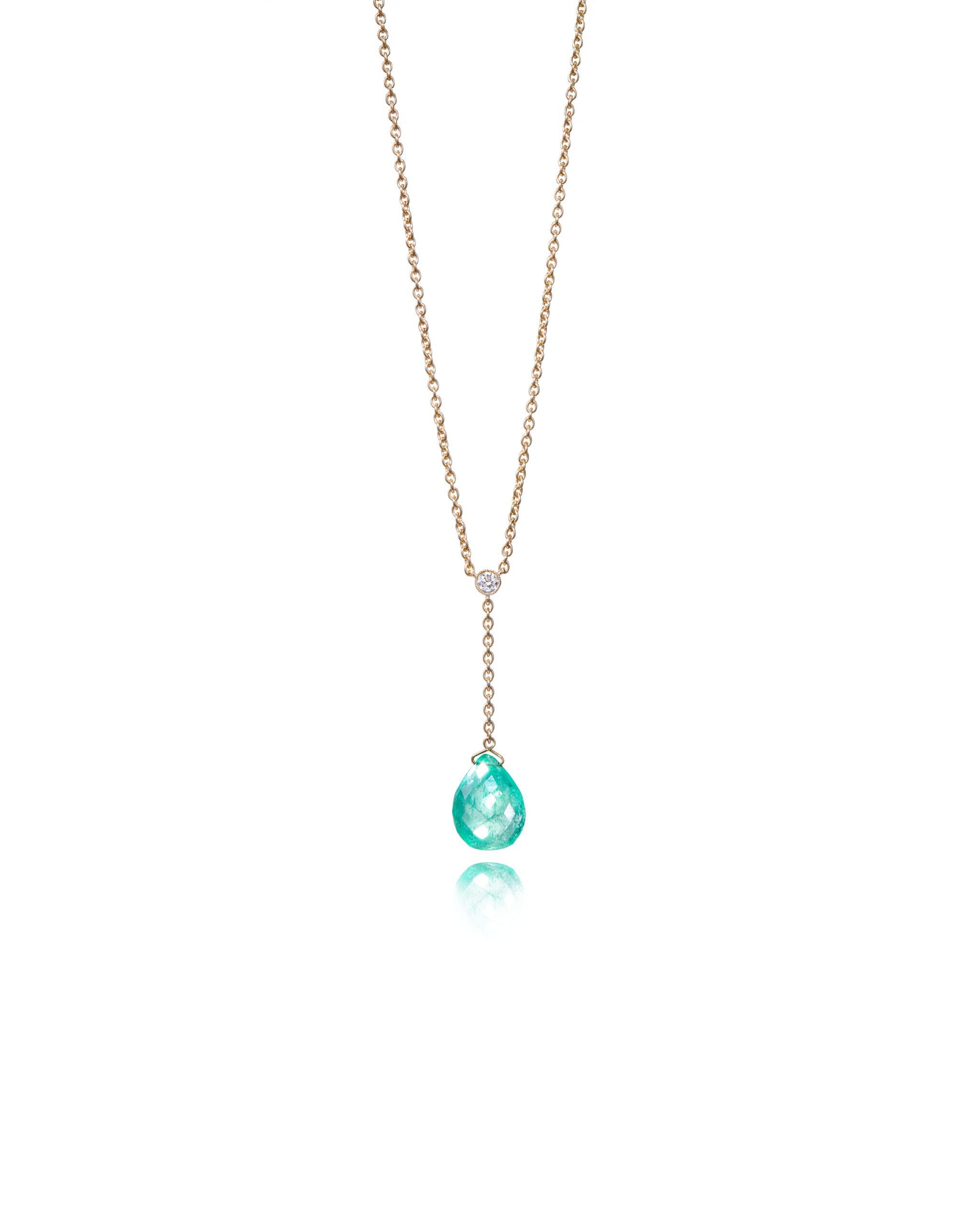 A delicate necklace with a briolette cut emerald and a brilliant cut diamond. The emerald used in the necklace is Colombian, renowned for its exceptional quality and unmistakably deep green hue. Its rich color and crystalline clarity elevate the piece into something extraordinary — a necklace that doesn’t just catch the light, but seems to cast its own, shimmering far and wide.