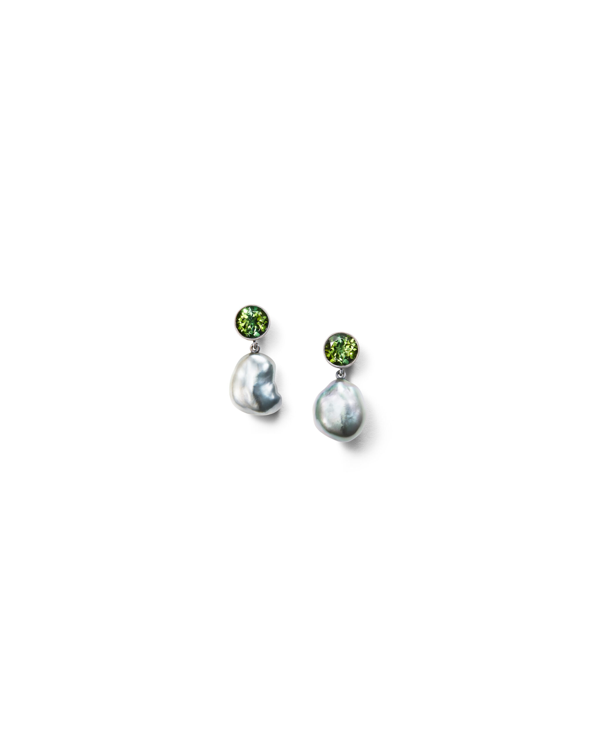 Meet our delicate pearl drop earrings with green tourmalines. Baroque-shaped Tahitian Keshi pearls guarantee individuality, making it impossible to find two alike. In these earrings the grey-hued pearls are combined with deep green tourmalines in milgrain setting. The outcome creates an astonishing beautiful impact. Prices vary depending on the final design and options. Handcrafted by our finest goldsmiths in Helsinki.