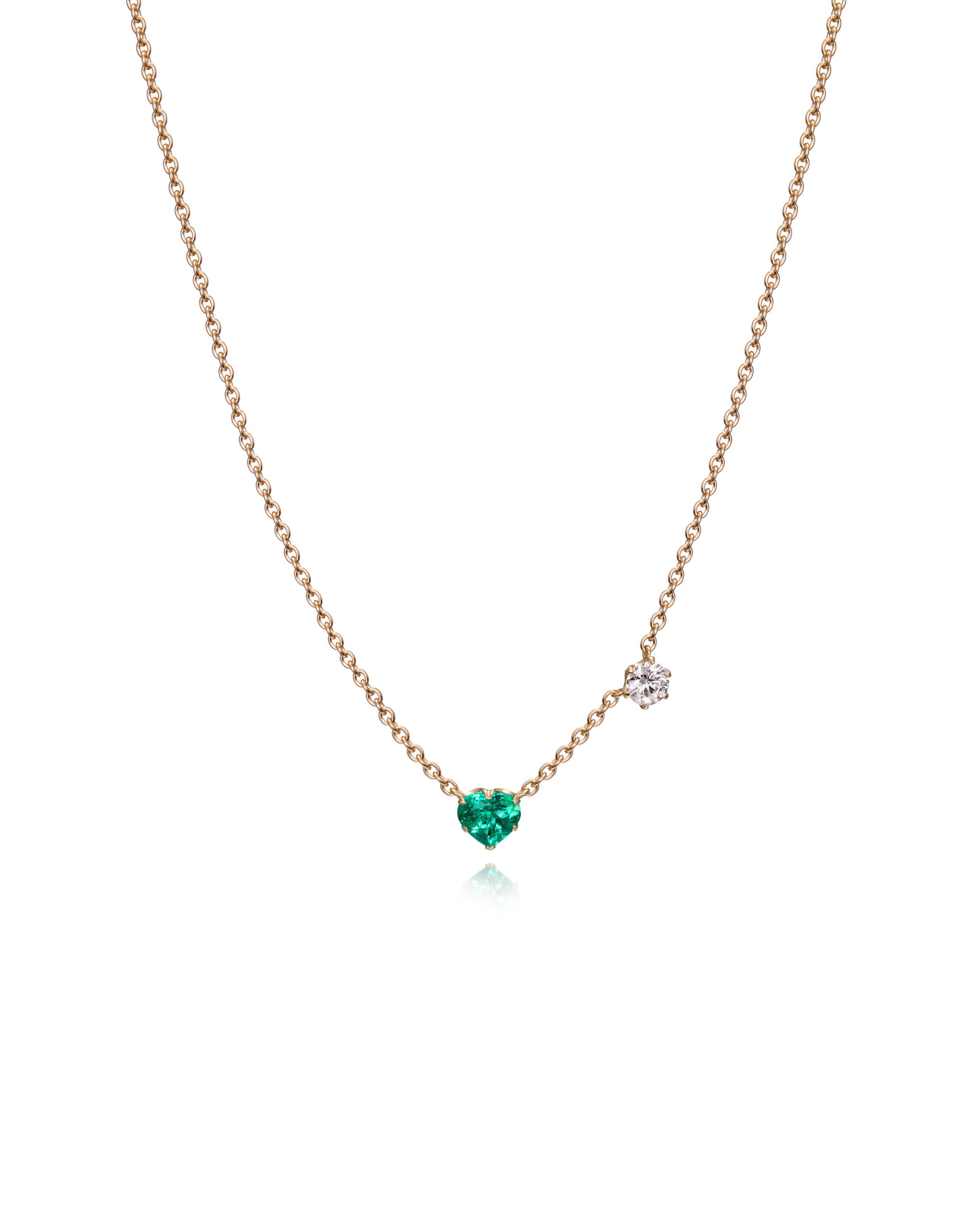 Our Side by Side Necklace features a heart-shaped emerald paired with a round brilliant cut diamond, both set in a graceful prong setting. The emerald’s vibrant green hue comes from the trace elements vanadium and chrome within its crystal structure, giving the stone a lively, natural glow that’s as unique as you are. The heart-shaped emerald adds an adorable, romantic touch, while the classic diamond delivers timeless sparkle.