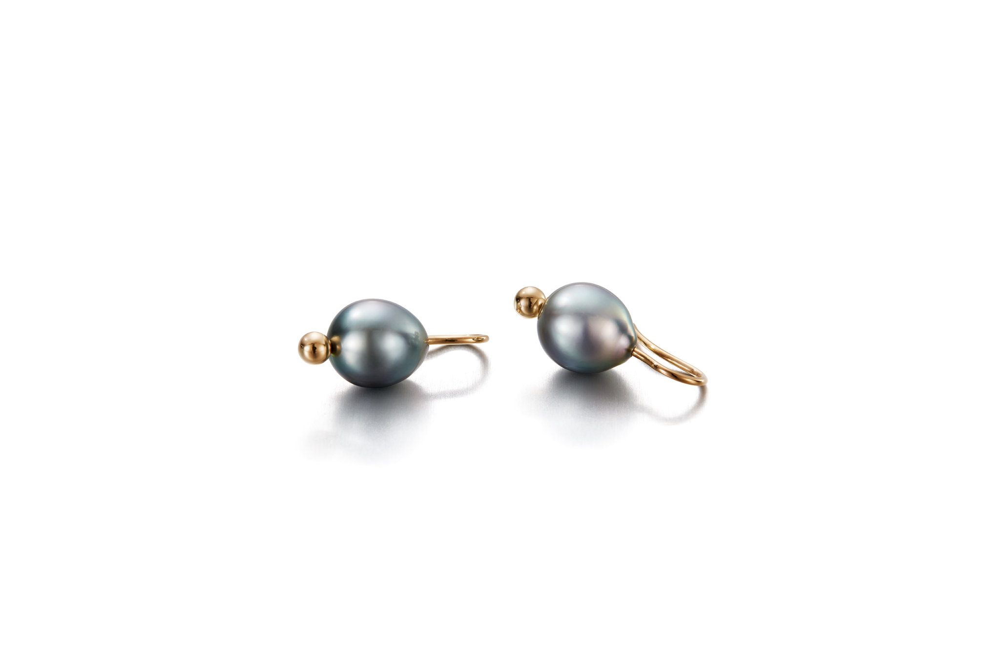A Tahitian pearl earrings with a Silhouette-sphere. The gold sphere makes the earrings more vivid-looking. The simplicity of the piece of jewelry allows it to be worn year-round.