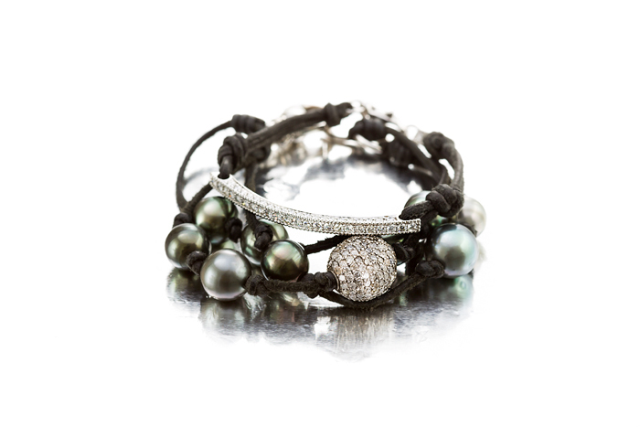 A Leather Cord Bracelet with Pearls and Diamonds