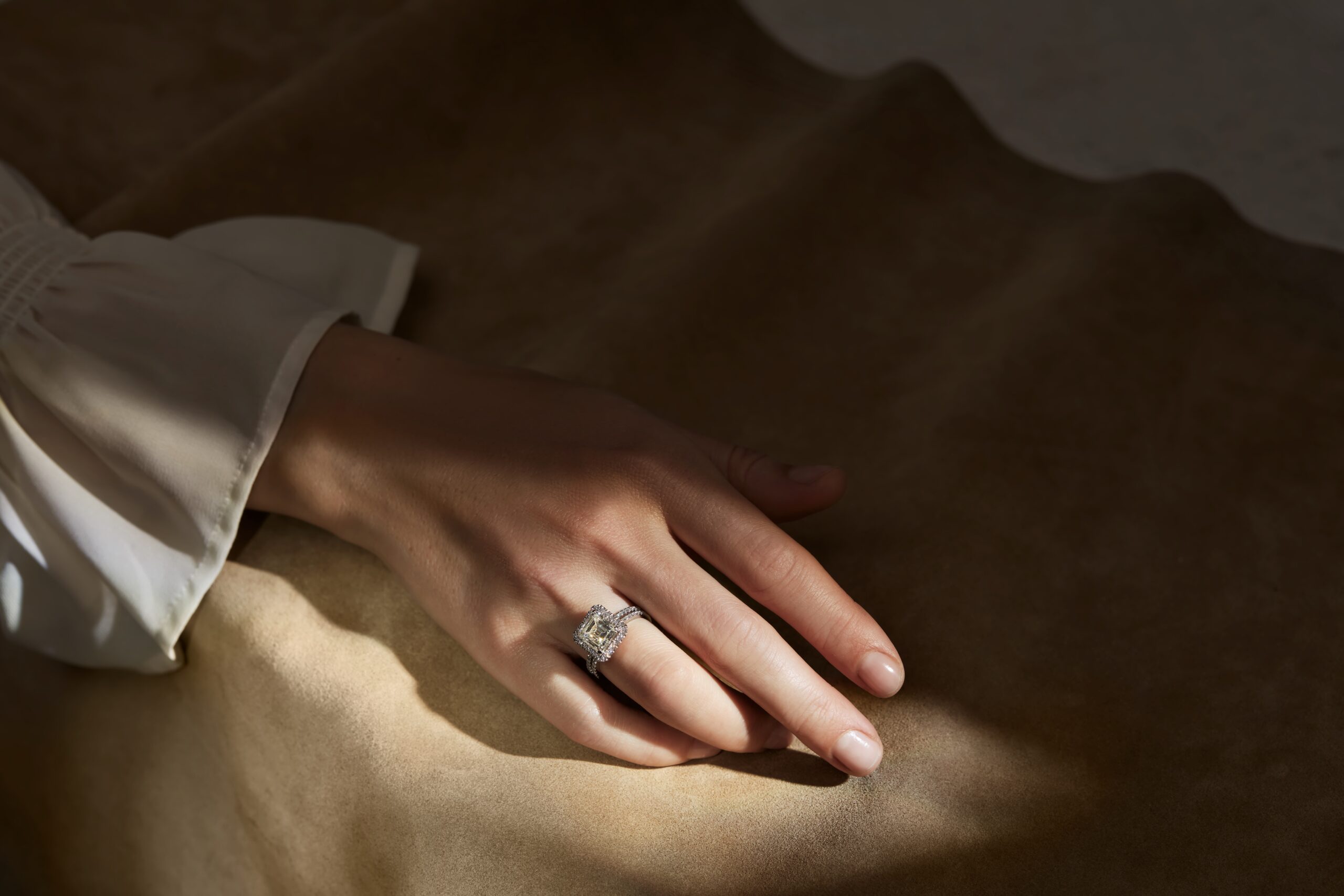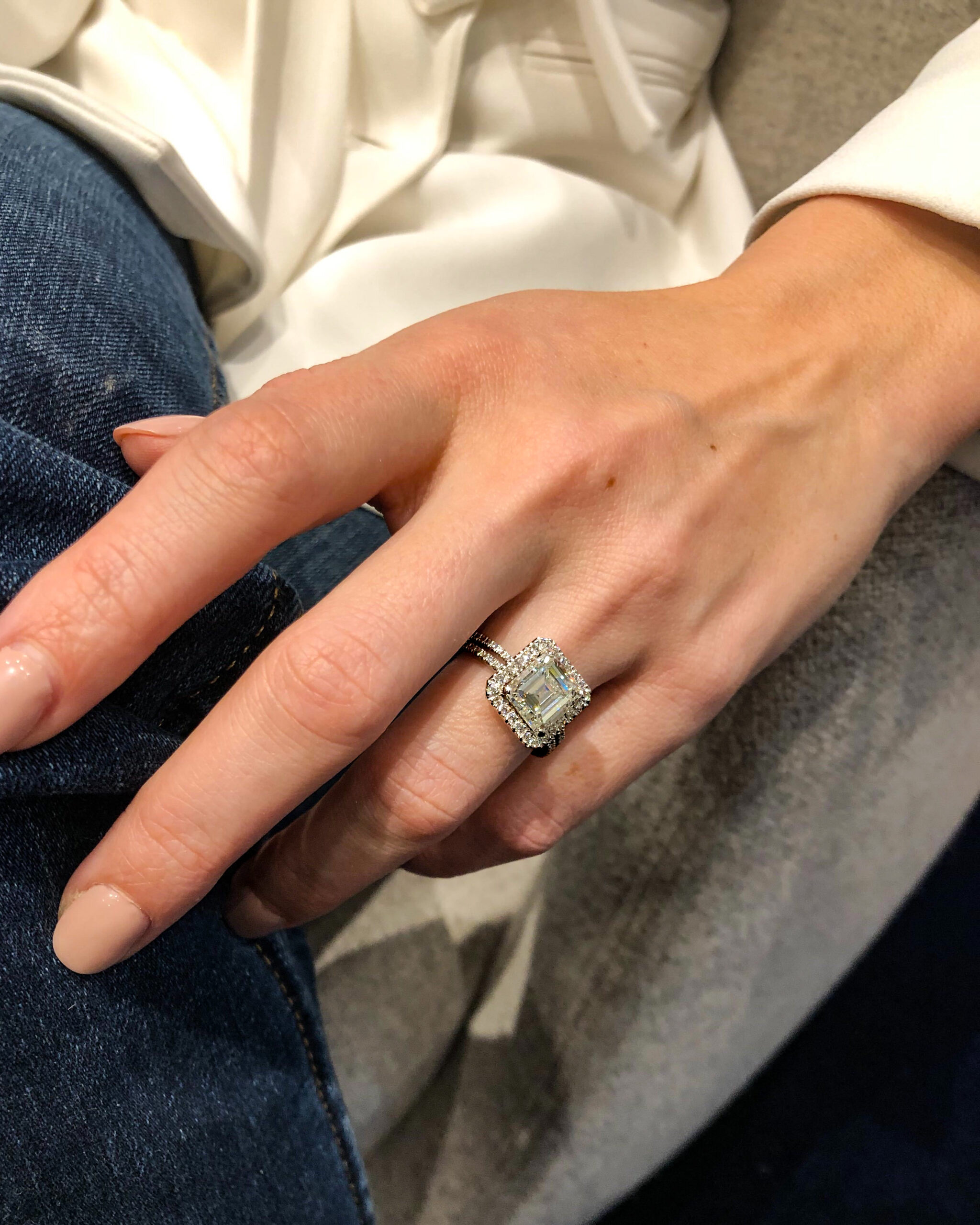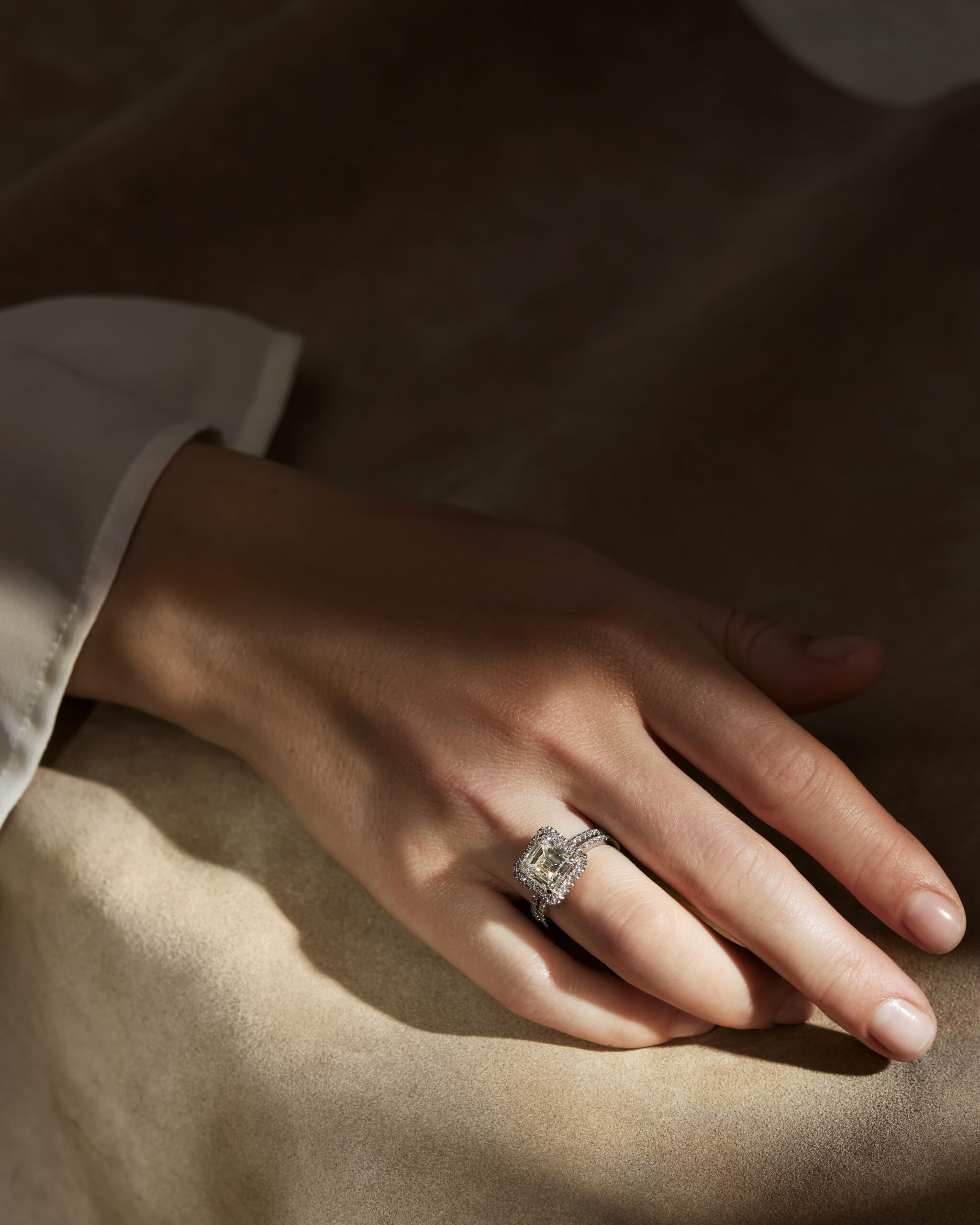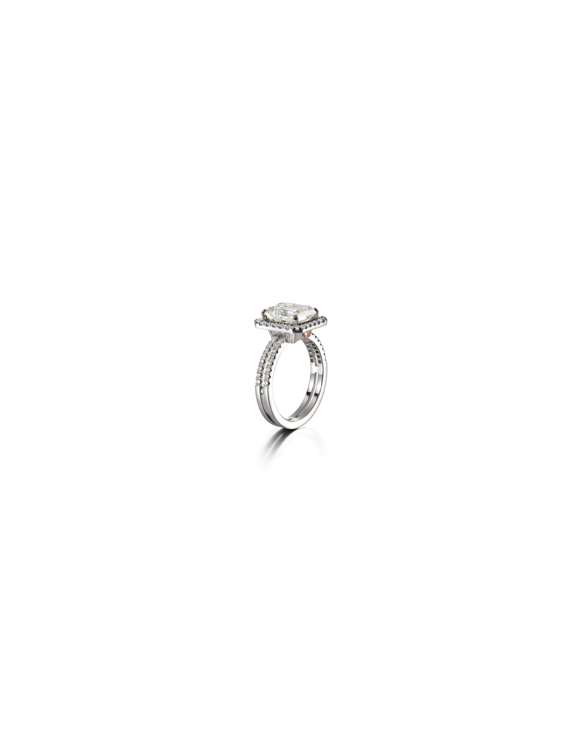 A beautiful diamond halo ring, with an emerald cut center stone. The center diamond is is surrounded by small brilliant cut diamonds. The ring has a double shank, with small brilliant cut diamonds. Price upon request. Handcrafted by our master goldsmith Janne Salminen.