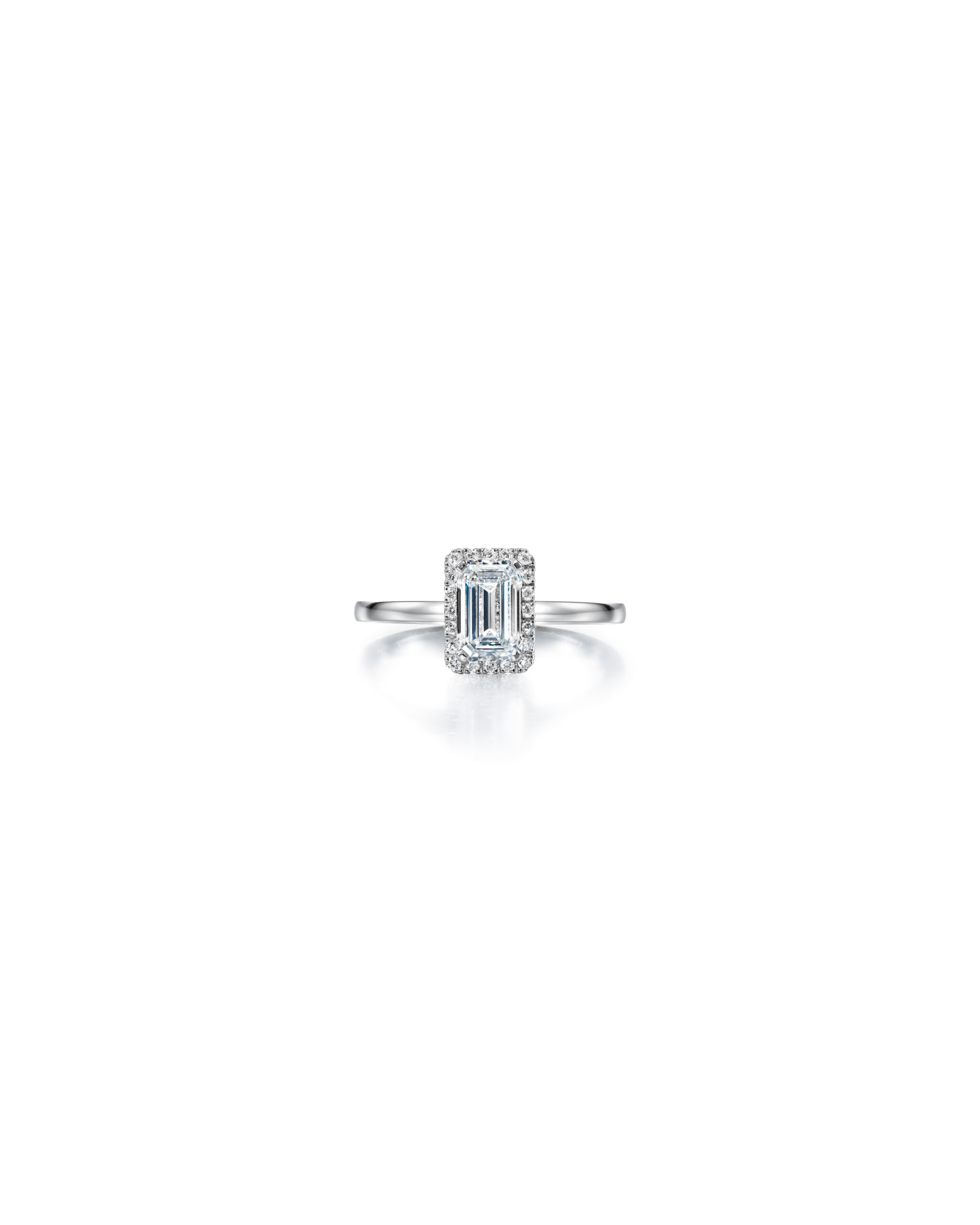 The stunning emerald cut diamond halo ring is surrounded by smaller brilliant cut diamonds. Add a beautiful wedding band next to it, and you will be the bride of the year. Handcrafted by our finest goldsmiths in Helsinki.