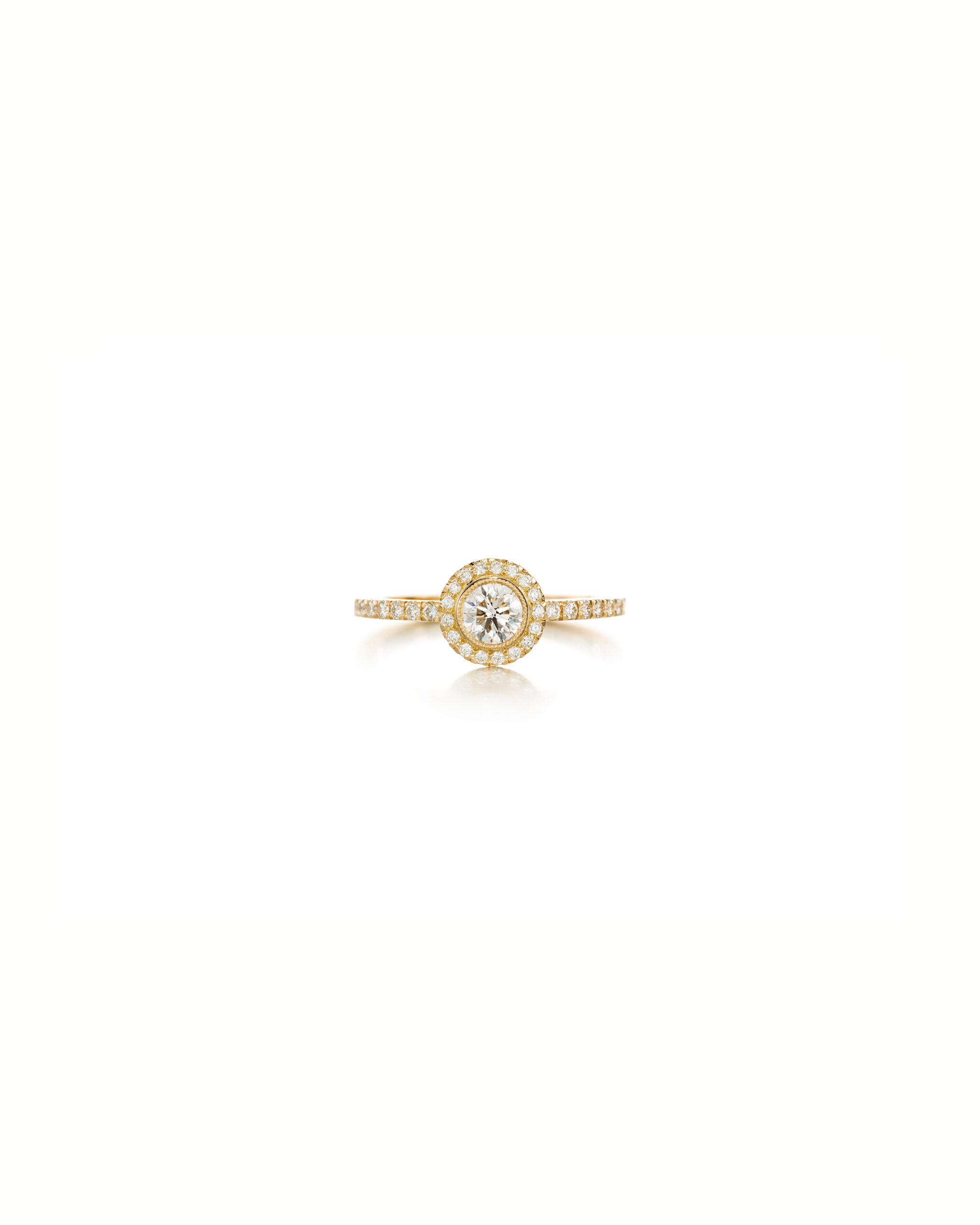 A classic halo diamond ring. The center stone is a brilliant cut diamond. This model is also available without the diamonds in the shank. In this case contact us via the request form to share your wishes, and we’ll get back to you shortly. Handcrafted by our finest goldsmiths in Helsinki.