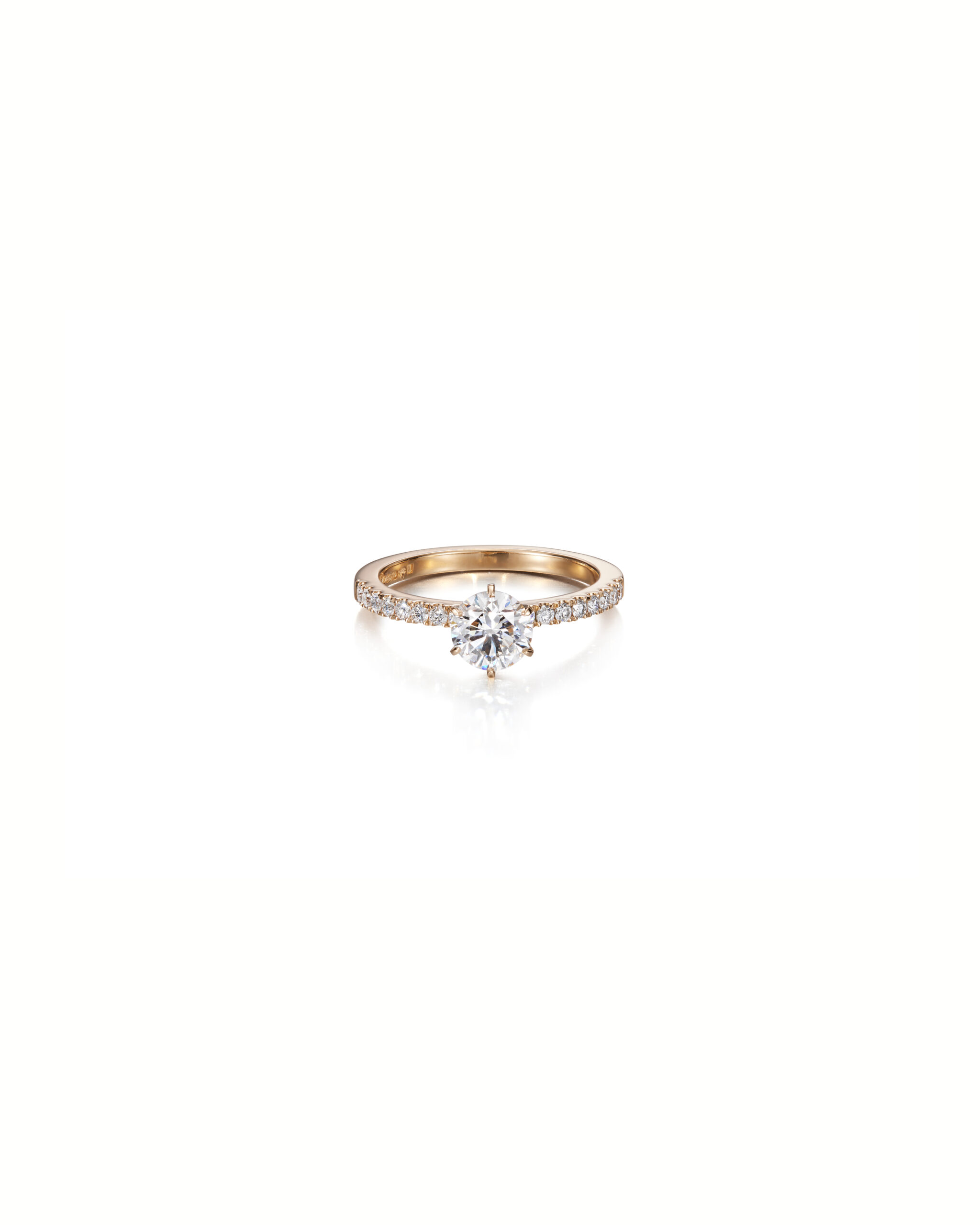 This diamond solitaire ring with diamond band is one of our most popular engagement ring model. For optimal proportions, we recommend a center stone weighing at least 0.50ct. Possible to order also in 18k white gold or platinum. The yellow gold ring is out of stock, contact us via the request form to share your wishes, and we’ll get back to you shortly.