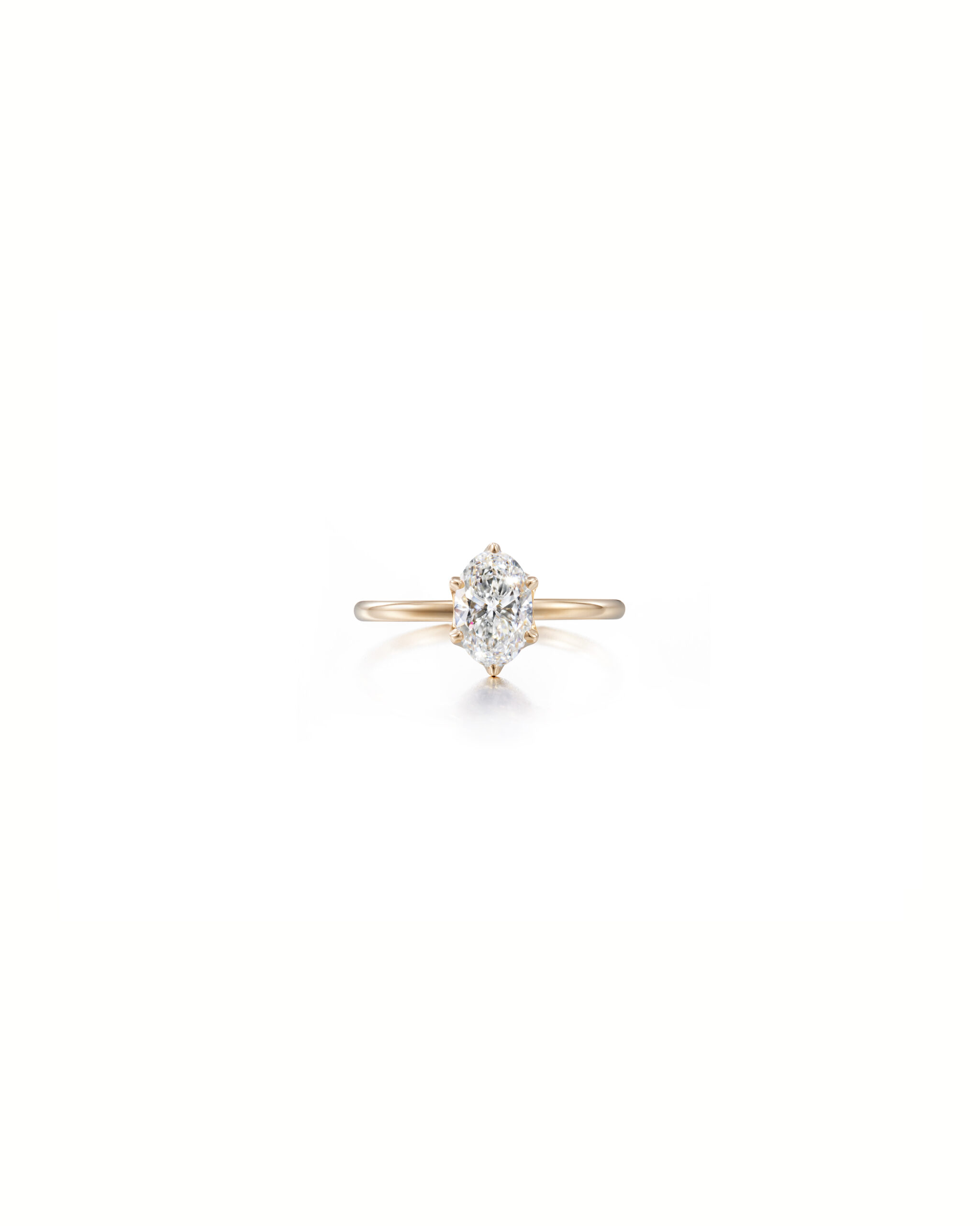 The oval diamond solitaire ring is today’s favorite. A band with sparkling diamonds is designed beside the ring to highlight the oval shaped diamond. A finished piece symbolizes eternal love. The product detail information is about the solitaire ring in gold.