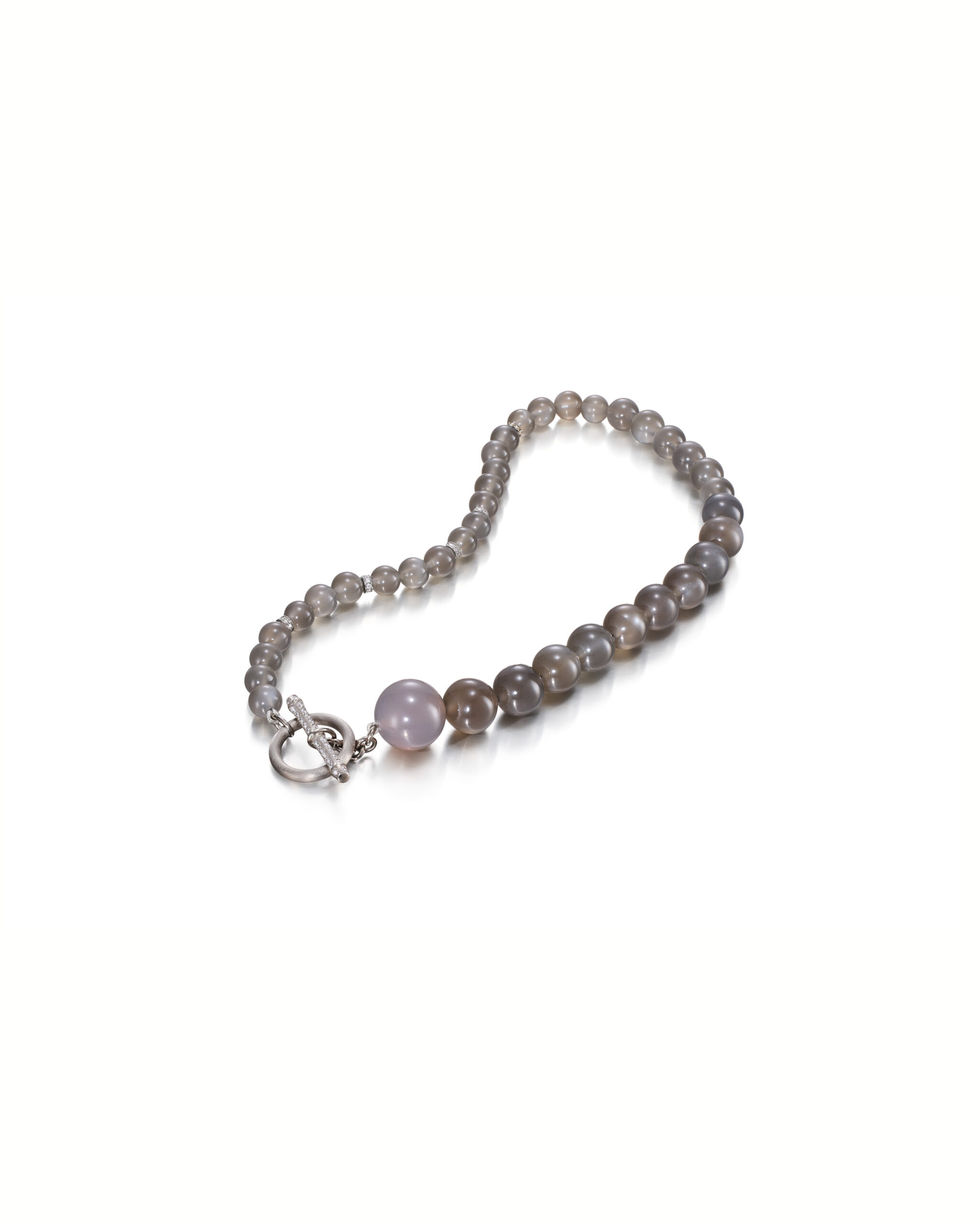 The Spotlight necklace plays with contrast by placing the large moonstone spheres at the T-lock. Small diamonds spread an even, radiant glow across the entire necklace. The clasp is also handmade and adorned with small diamonds along the shaft. It can be made with other gemstones and pearls to suit taste. In this case, contact us via the request form to share your preferences, and we’ll get back to you shortly with fixed price and an estimated production time.