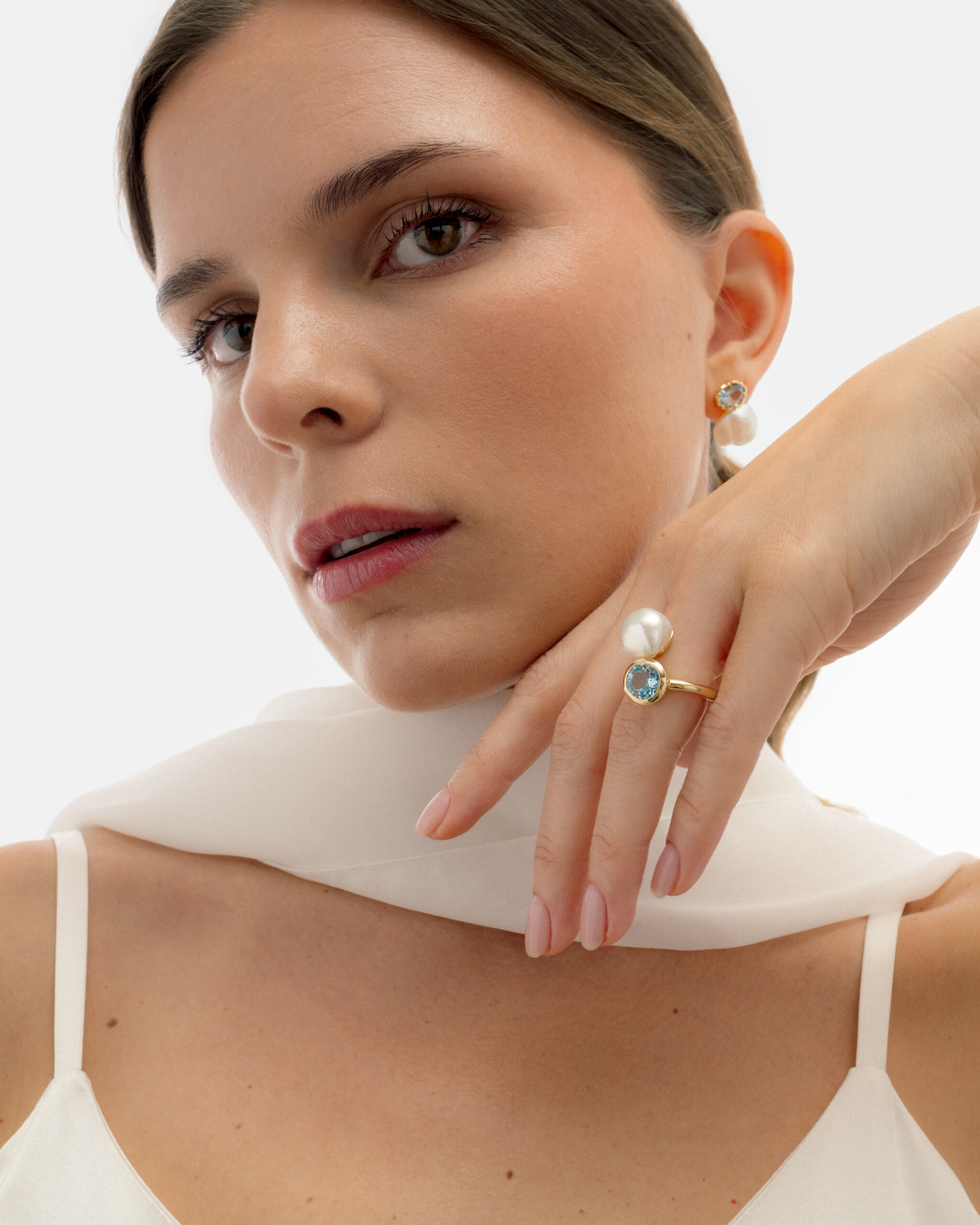 Our beloved icon: the Ballet ring featuring aquamarine and a beautiful South Sea Keshi pearl. Keshi pearls are formed as accidental by-products of the pearl cultivation process. Keshi pearls are as close as we can get to a naturally formed pearl. Originating from the Japanese word for “poppy seed,” they are prized for their high luster, irregular baroque shapes, and organic beauty.