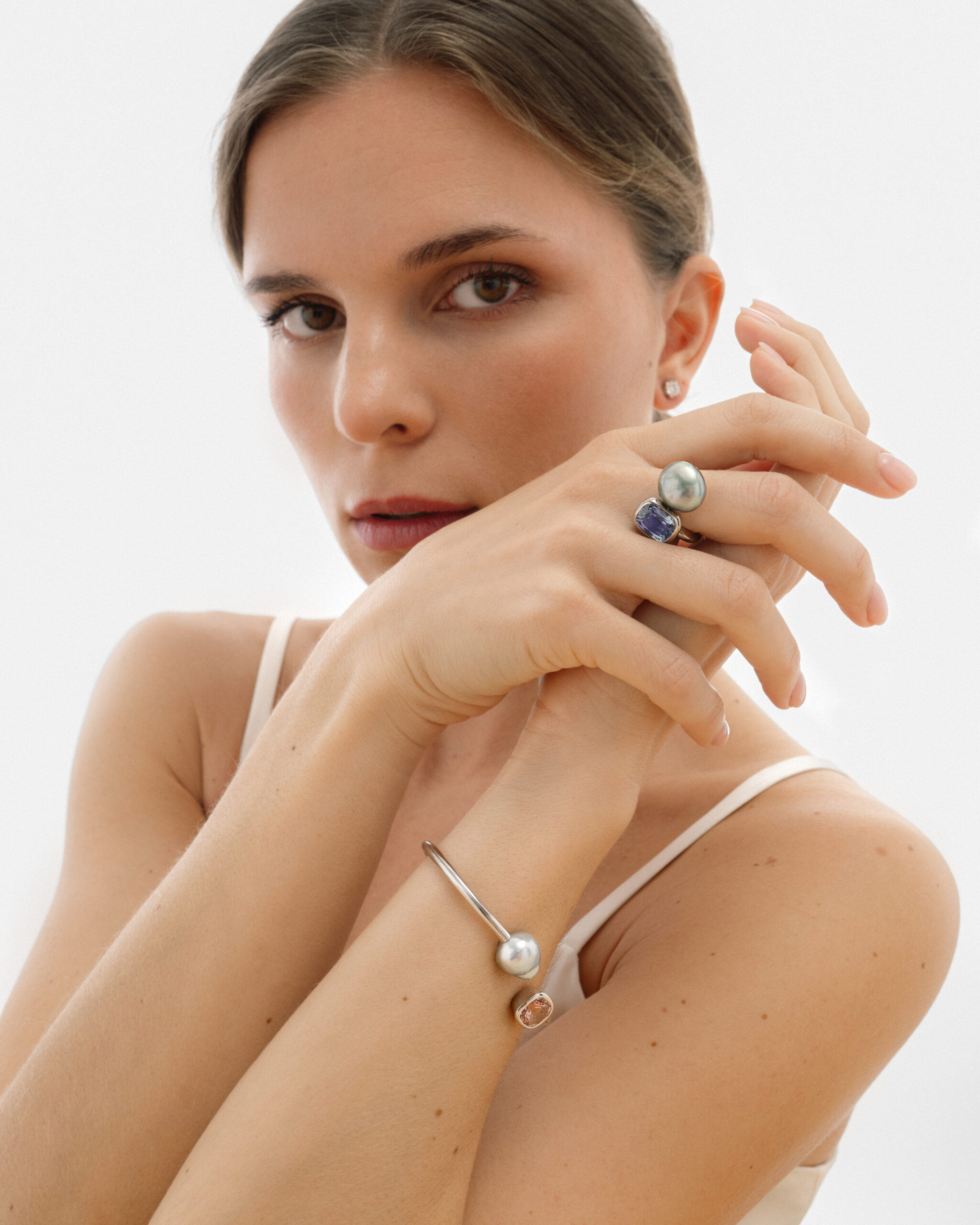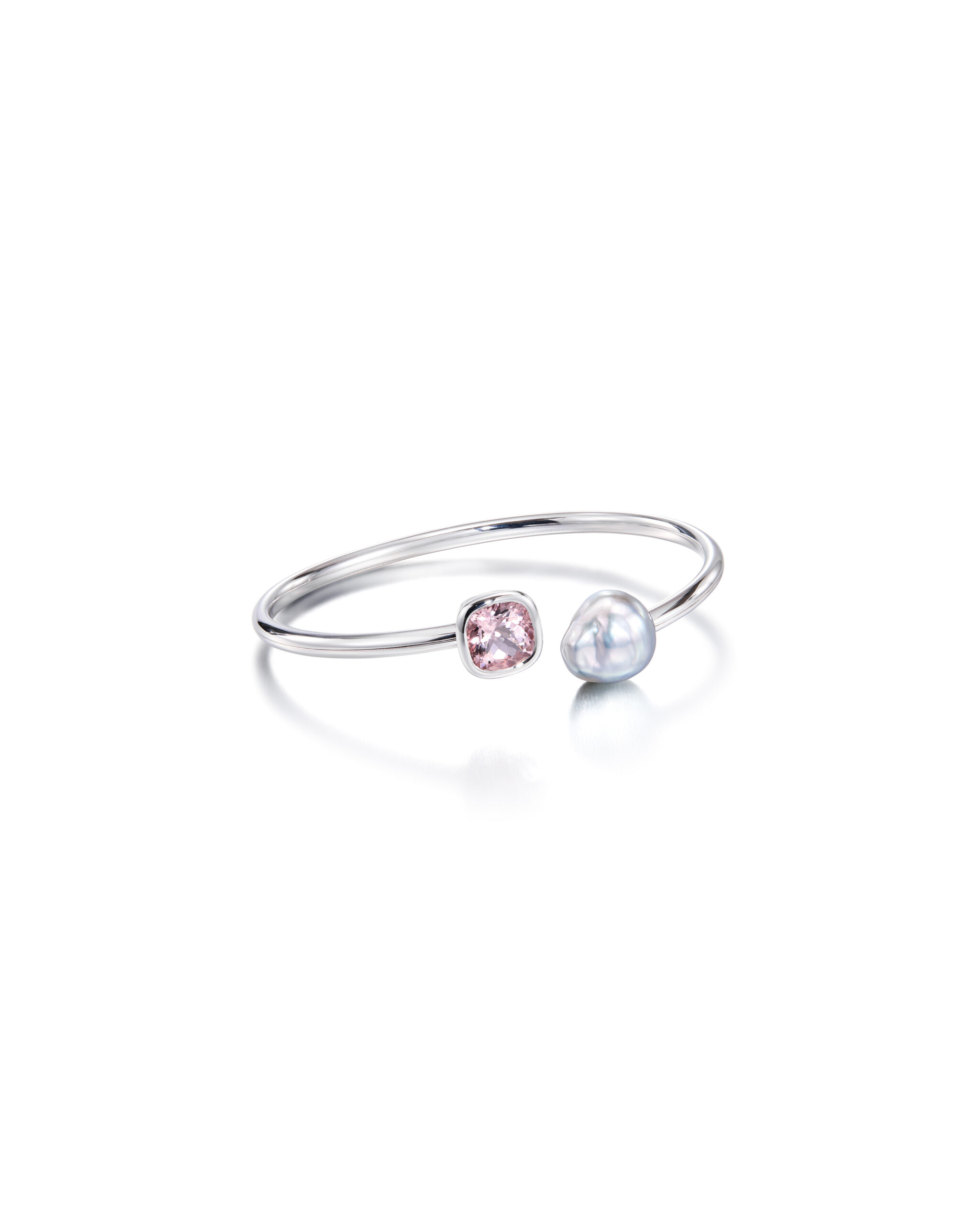 A stunning bangle bracelet features a soft pink morganite and a South Sea pearl. Morganite, a member of the beryl group, is predominantly sourced from pegmatite mines in Minas Gerais, Brazil. It can appear pink, purplish-pink, or orangey-pink, typically in a delicate, light hue. This gemstone has quickly become one of our favourites at Atelier Torbjörn Tillander.