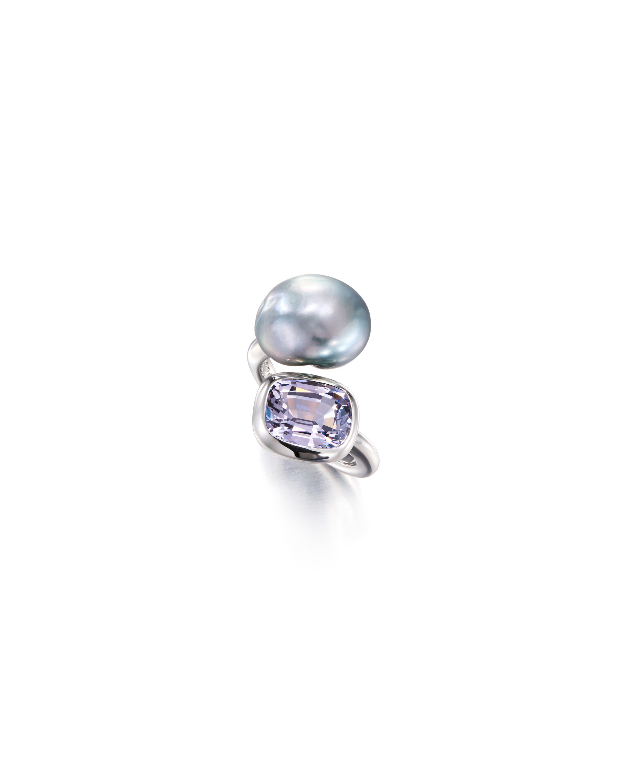 Our favorite the ballet ring showcases a lilac spinel and a grey baroque Tahitian pearl in white gold. Perfect for the jeans girl who loves casual cool. Wear this ballet ring on your ring finger and pair it with a diamond eternity ring on the opposite hand for a minimalist statement.