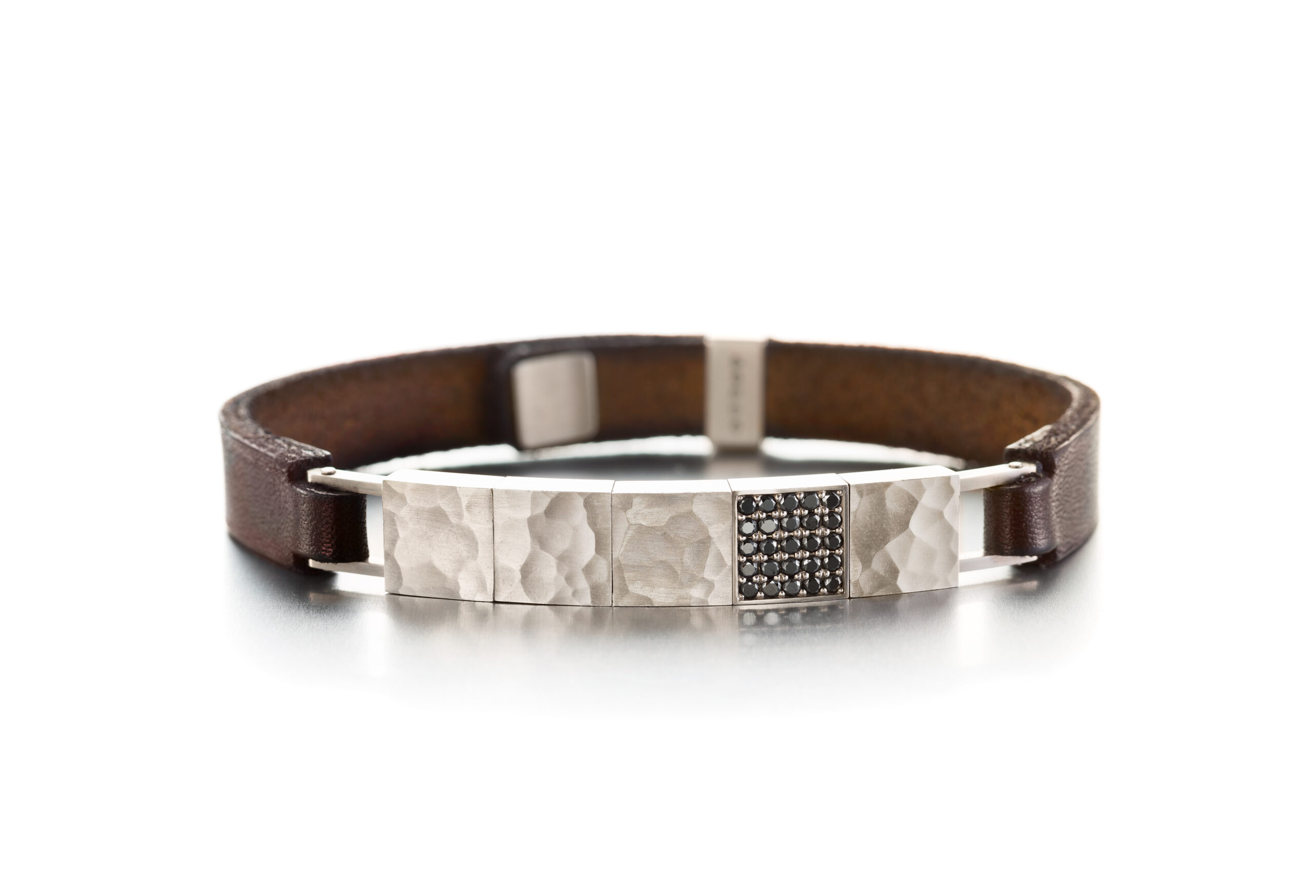 The tiles made of white gold can be decorated in different ways – here the tiles are hammered and one tile is adorned with black diamonds, giving the name for the ring. The tiles can also be engraved with initials or a monogram. The tiles can also be made in yellow gold. Contact us through the request form to share your wishes of the material options, and we’ll get back to you shortly with fixed price and an estimated production time.