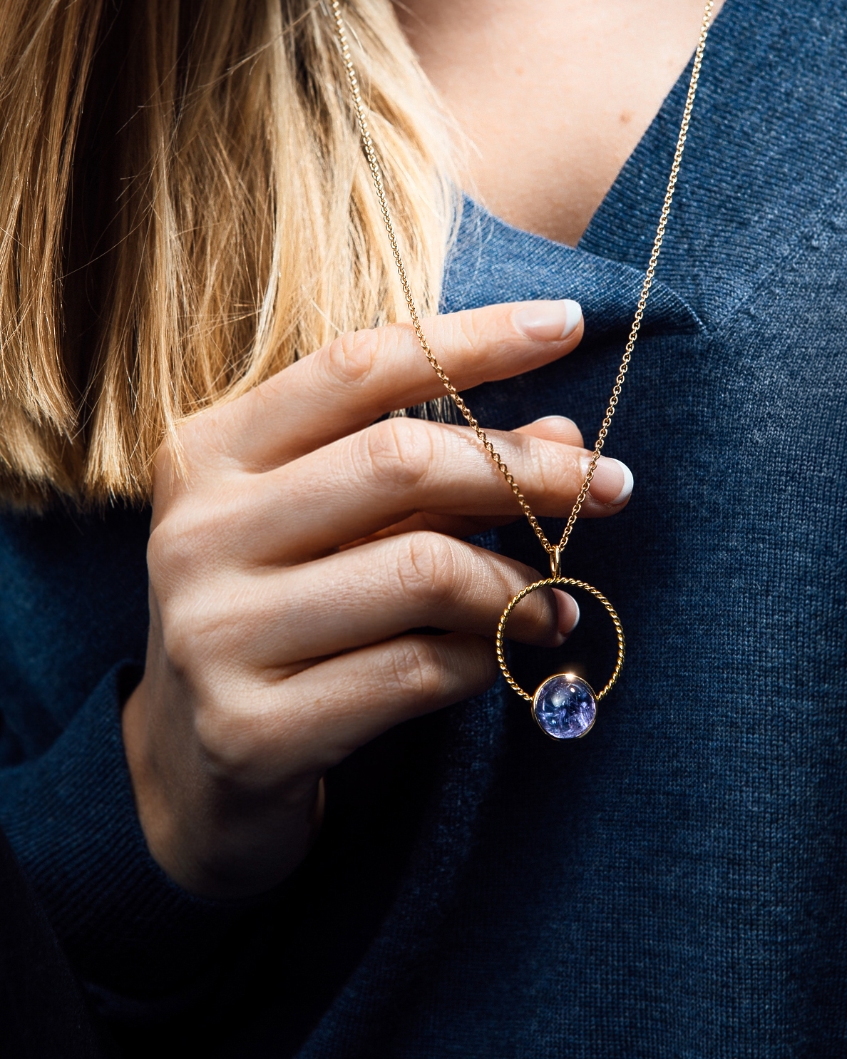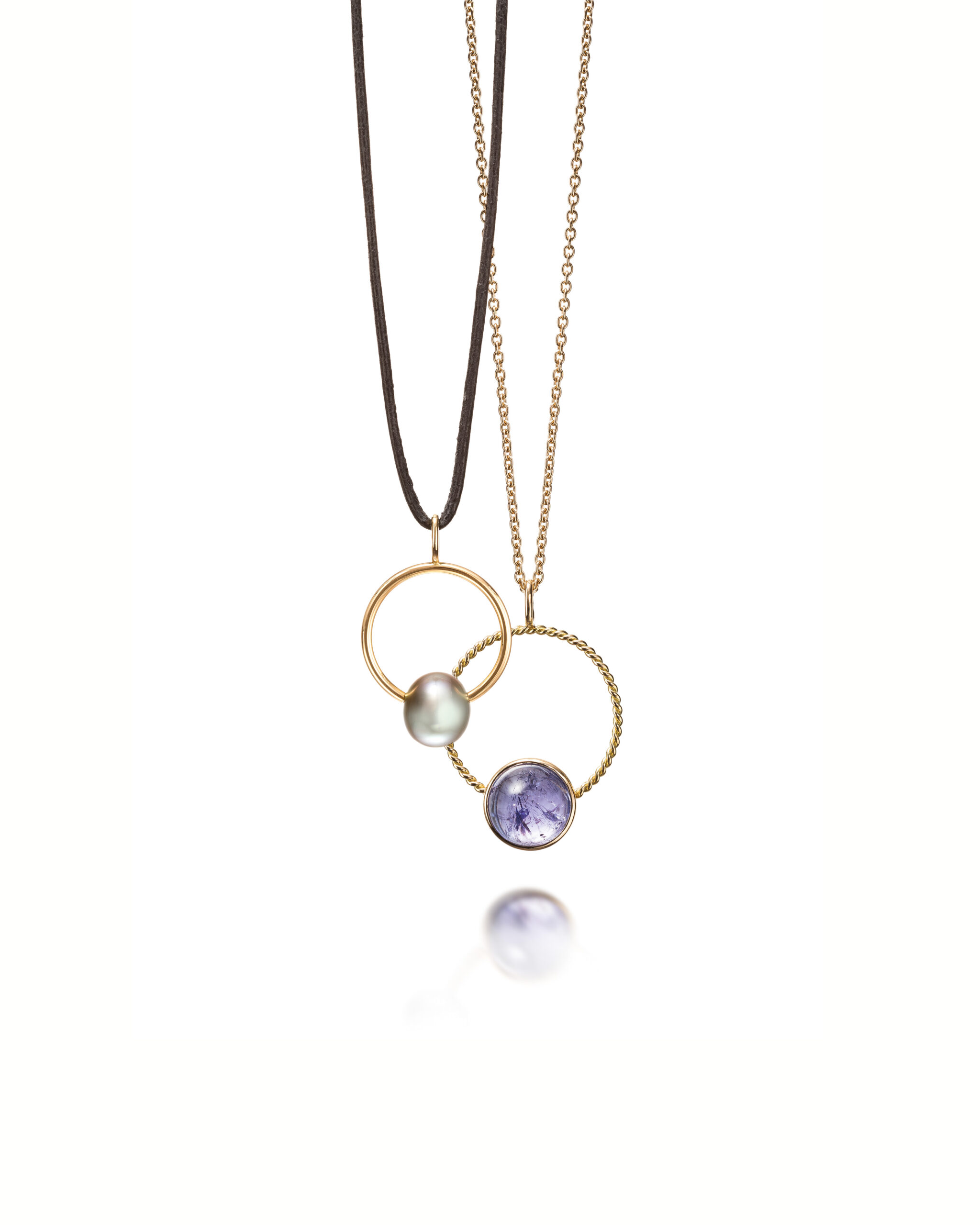 The iconic Happy pendant, with its silver-toned Tahitian pearl and leather cord, creates a grounded yet stylish look. The mysterious Happy X Bondie pendant is adorned with a striking purple amethyst. The gold ring of the pendant is twisted, adding a refined, intricate detail to its design. Handcrafted in Helsinki by our finest goldsmiths.