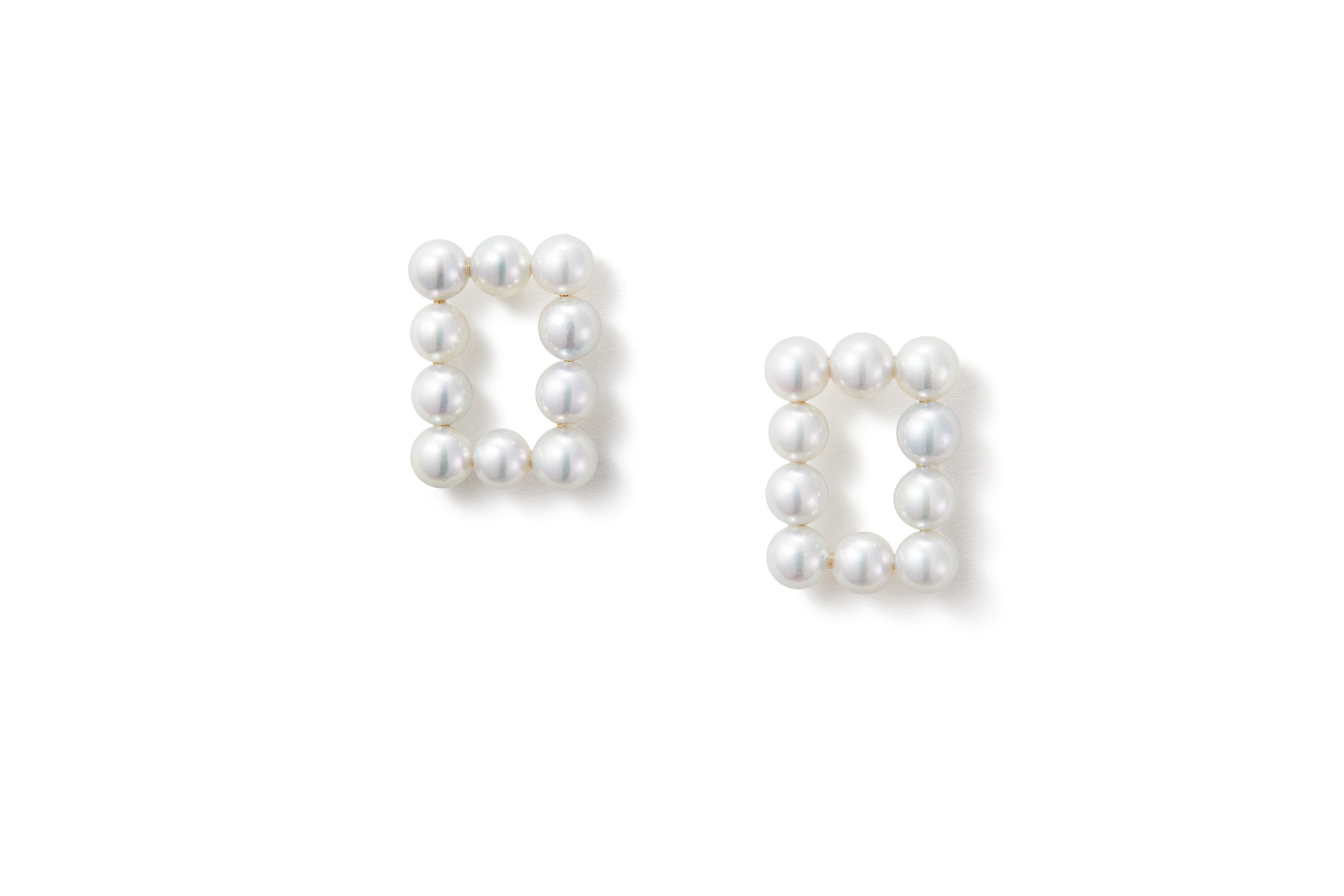 Stud earrings featuring Akoya pearls set in an elegant, airy rectangular frame. The lustre of the pearls brings softness to the ensemble. Design by Jenny Tillander.