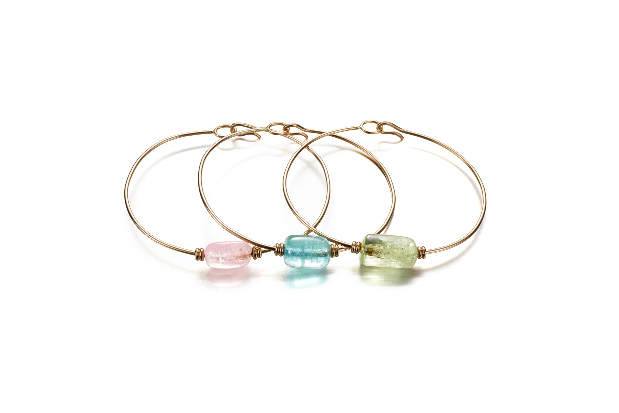 Our classic Happy bangle bracelet is also possible to make with gemstones. Different shades of colored tourmalines are shown in the image. For an extra spark, we have strung the gold thread close to the gemstones for a finished look. Contact us via the request form to share your preferred gemstone, and we’ll get back to you shortly with the estimated production time.